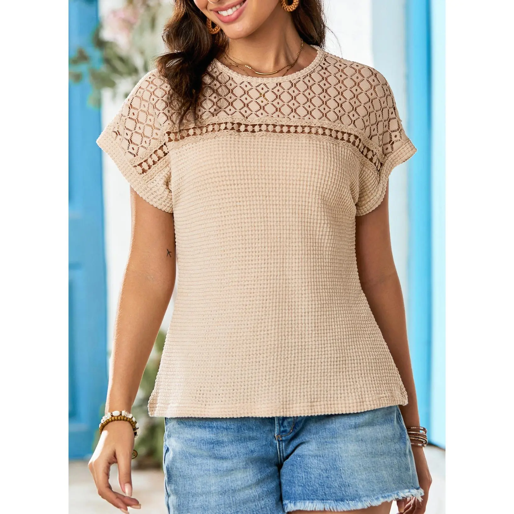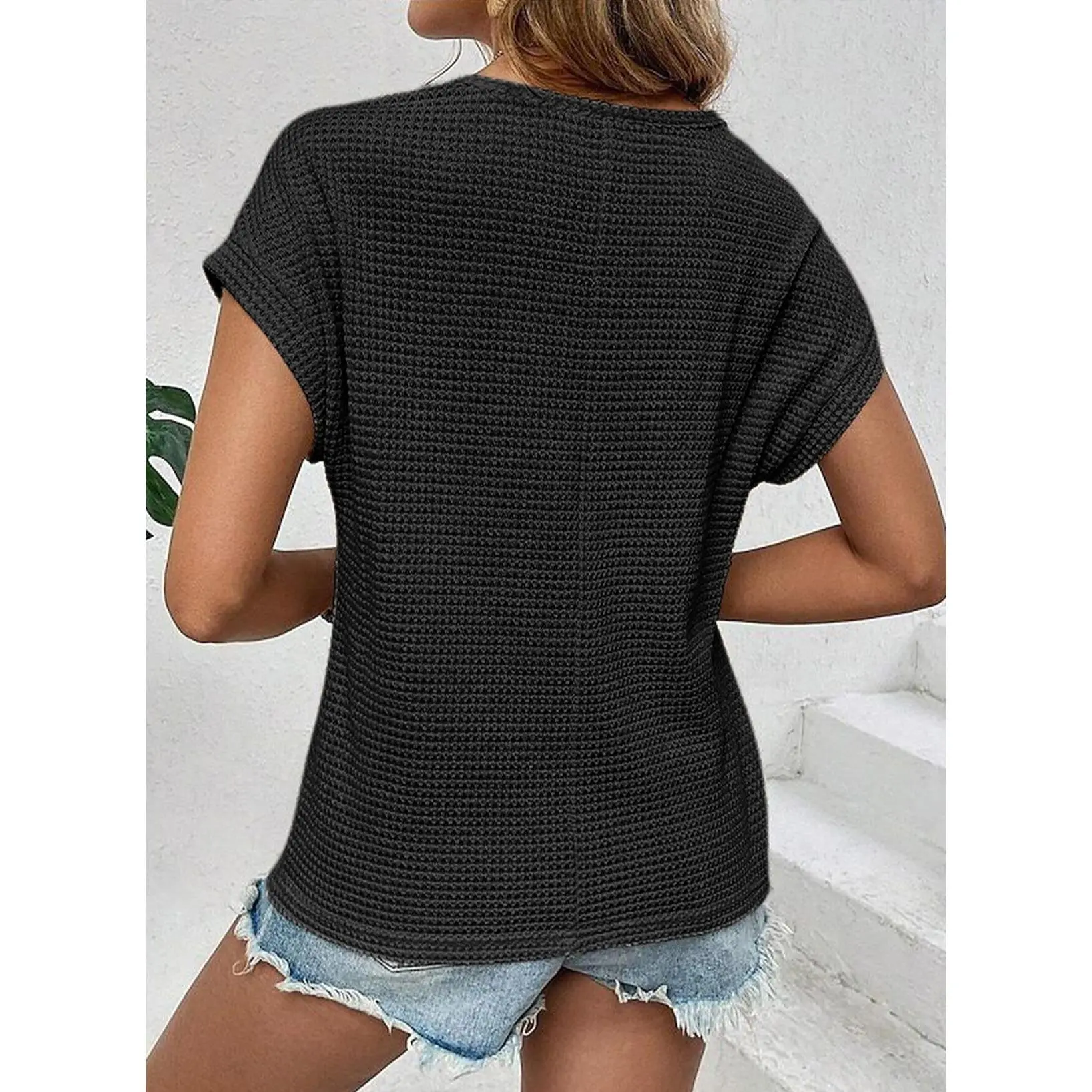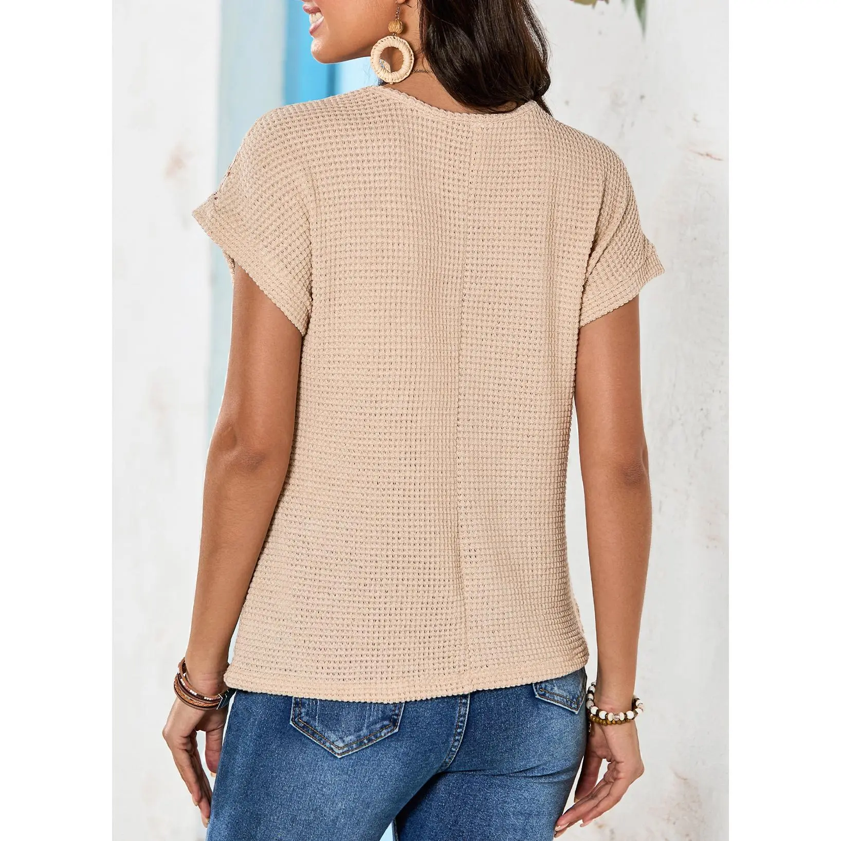 ·Feature: Short Sleeve Tops for Women, Solid Color, Crochet T-Shirts, Women Waffle Knit T Shirts, Crew Neck, Crochet Top, Lightweight Knit Shirts for Women, Unique Knitting Pattern, Loose Fit Pullover Top, Relaxed Fit.