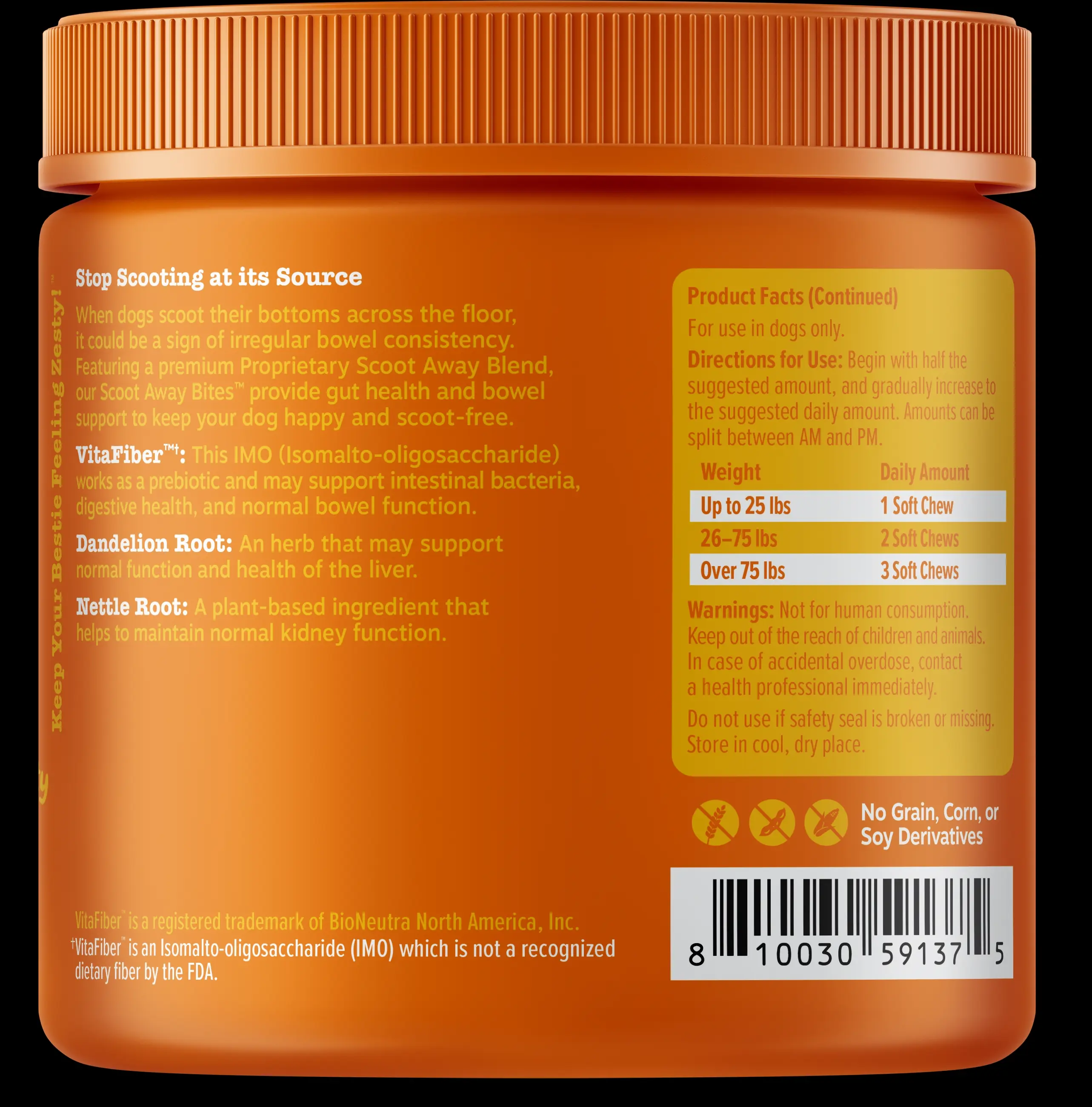 Featuring VitaFiber (an Isomalto-oligosaccharide (IMO) which is not a recognized dietary fiber by the FDA), a Proprietary Scoot Away Blend, Mineral Oil, and Vitamin E, these Scoot Away Bites provide gut health and support for normal bowel function to keep adult and even senior dogs (large or small) feeling their zestiest.