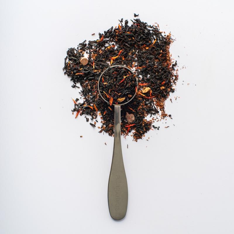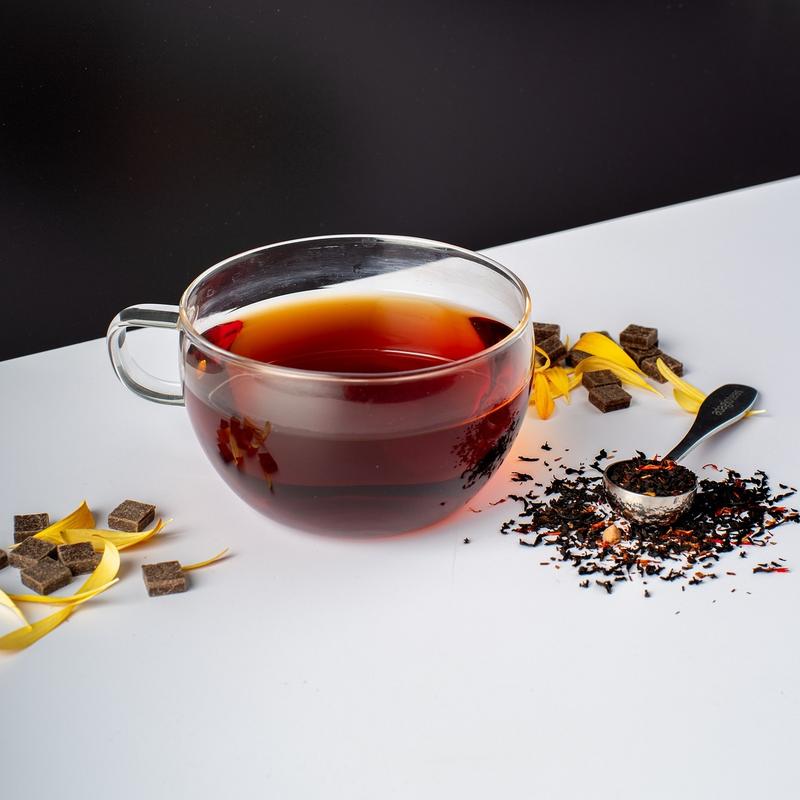 Blended With Black Tea, Rooibos Tea, Mango Pieces, Natural Mango Flavor, Safflower, Dark Chocolate Chips, Cocoa Nibs, Natural Vanilla Flavor & Natural Chocolate Flavor