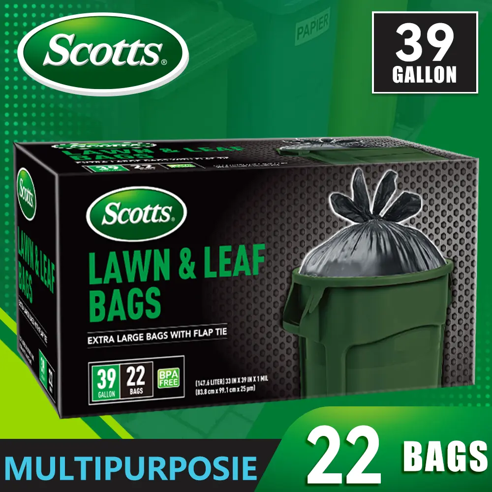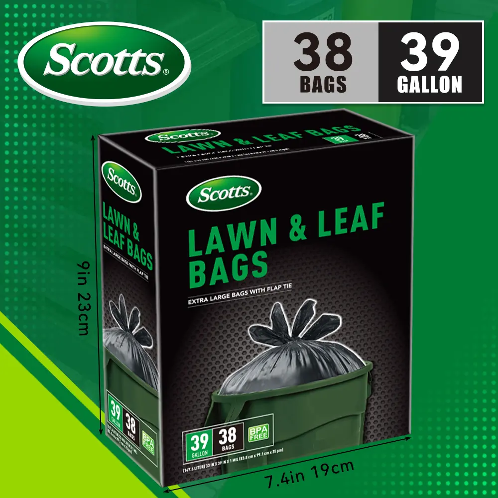 Scotts 39 Gallon 38 Bags Box Disposable Non-Rip Black Large Garbage Bags are perfect for various uses. These bags are designed for kitchen cans, industrial settings, gardens, homes, and commercial needs. They offer durability and are leak-proof, ensuring easy use. The multi-purpose cleaning supplies are ideal for maintaining cleanliness efficiently.