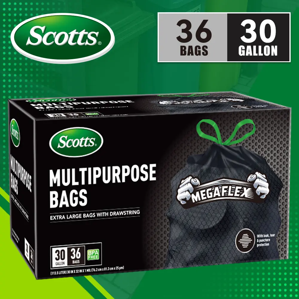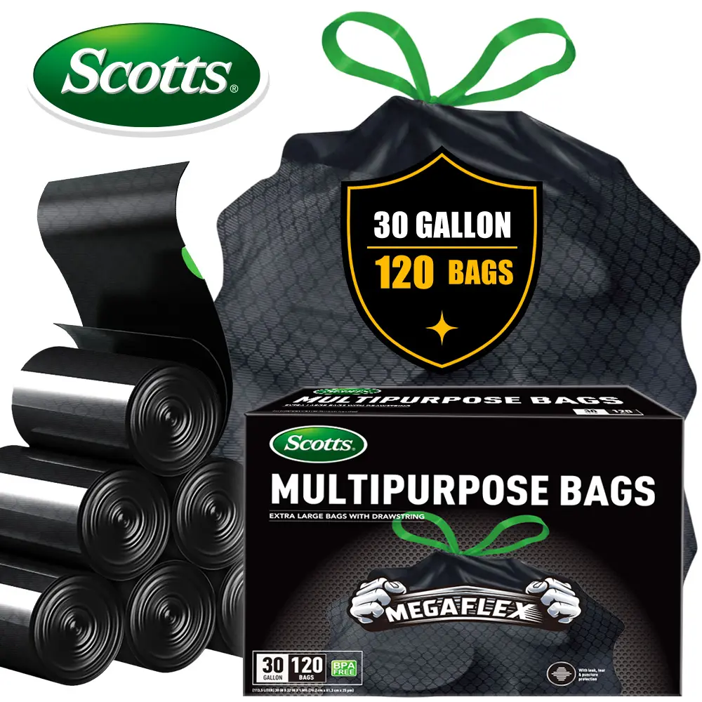Scotts 30 Gallon Boxed Disposable Non Tear Black Large Drawstring Trash Bags are perfect for large kitchen trash cans. These ultra-strong 113.5L bags are multipurpose, suitable for industrial, garden, home, and commercial use. They are durable, leak-proof, and easy to use. Each box contains 120 bags, ensuring you have plenty for your cleaning needs.