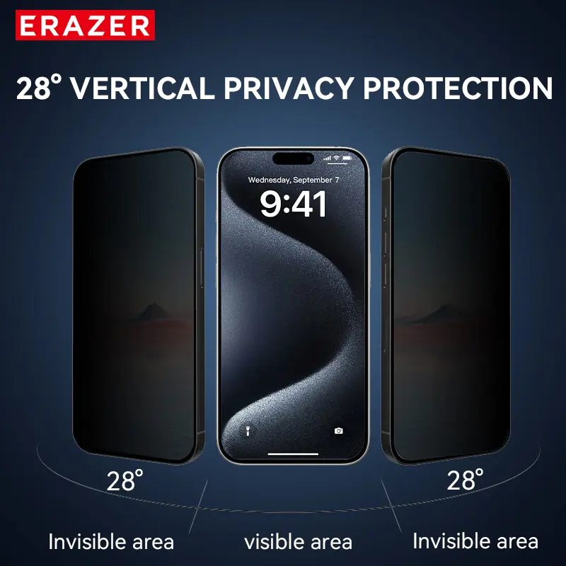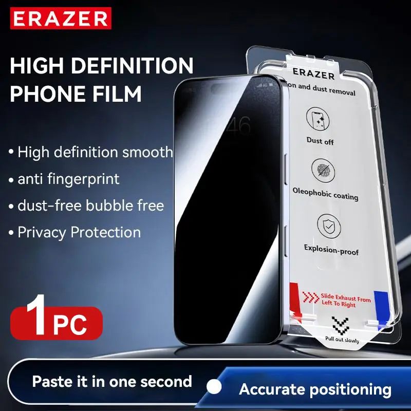 Ever worry about smudges, dust, or nosy onlookers when using your iPhone? ERAZER’s screen protector is here to save your day (and your screen)! With a smart dust-free chamber, you’ll get a perfect, bubble-free install every time—even if you’re a first-timer. The automatic dust removal tech means no more annoying dust particles trapped under your screen film. Plus, the oleophobic coating fights fingerprints and oil, keeping your screen crystal clear. Worried about privacy? The 28° anti-spy filter ensures only you see your screen, while still enjoying ultra HD clarity thanks to AR-enhanced transparency. It’s super thin at 0.33mm but tough enough to handle everyday drops with 9H hardness tempered glass protection. Compatible with iPhone 13 through 16 Pro Max models, it fits perfectly with seamless edges and corners. You’ll also love the smooth touch feel and quick Face ID unlock. What’s in the box? One ERAZER tempered glass screen protector with dust-free installation chamber. Ready to keep your iPhone screen flawless and private? Grab your ERAZER protector today and enjoy peace of mind wherever you go!