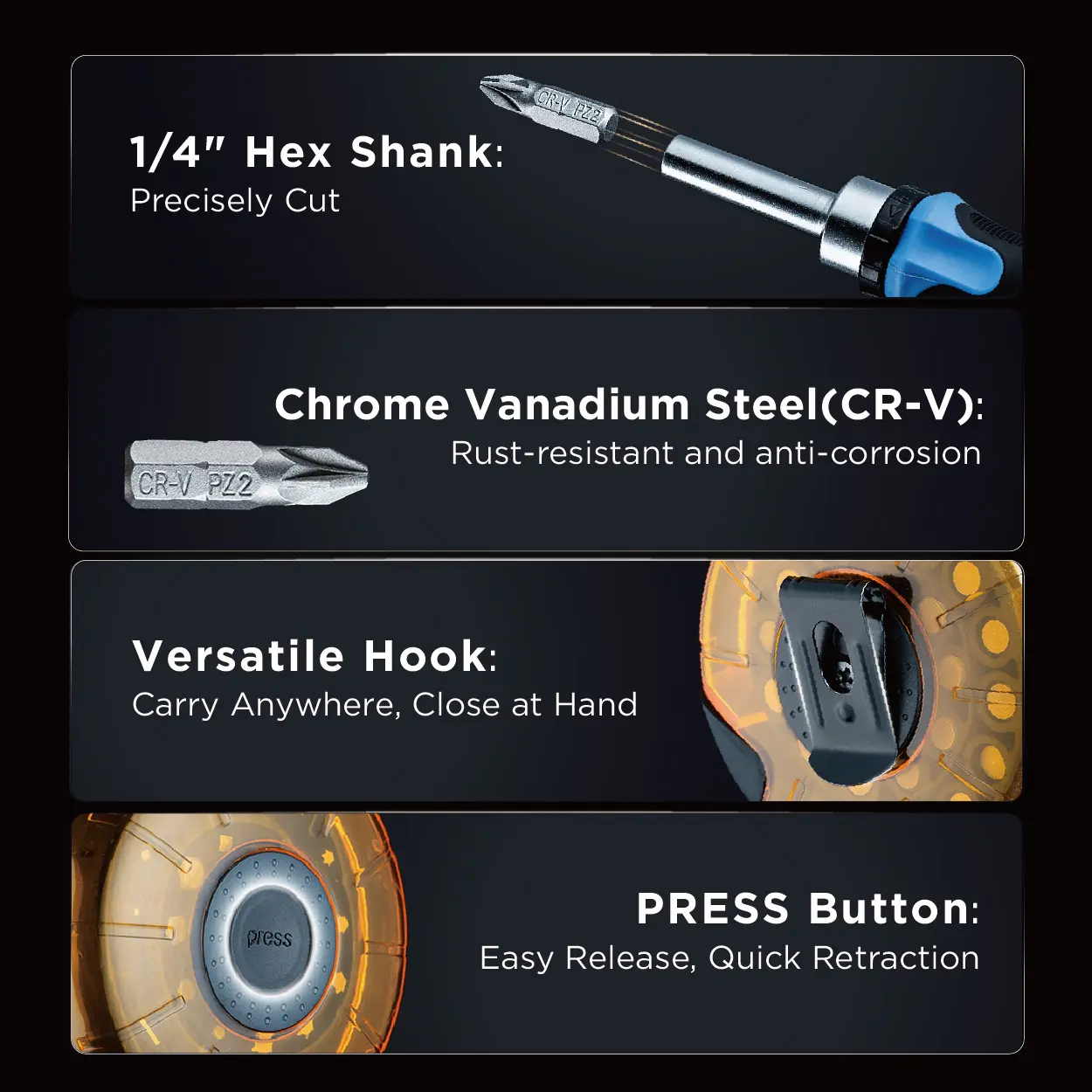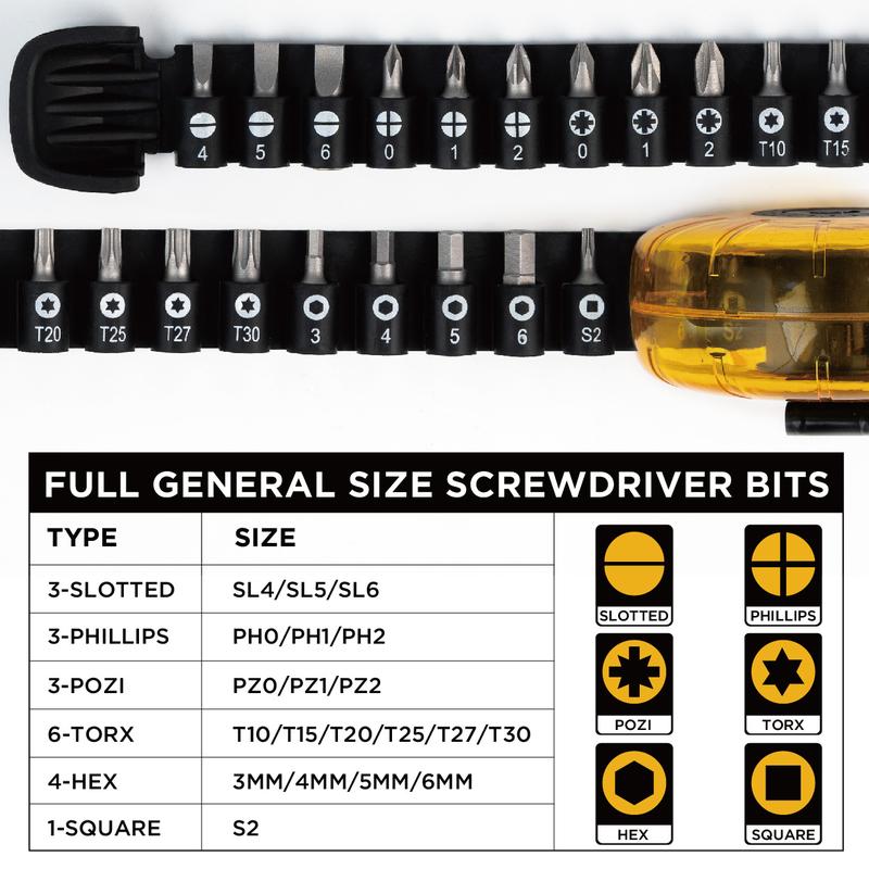 ·Common Sizes Included: Comes with all the essential sizes you need, including Slotted*3 (SL4/SL5/SL6), Phillips*3 (PH0/PH1/PH2), Pozi*3 (PZ0/PZ1/PZ2), Hex*4 (1*3mm/4mm/5mm/6mm), Torx*6 (1*T10/T15/T20/T25/T27/T30), Square*1 (S2) bits.