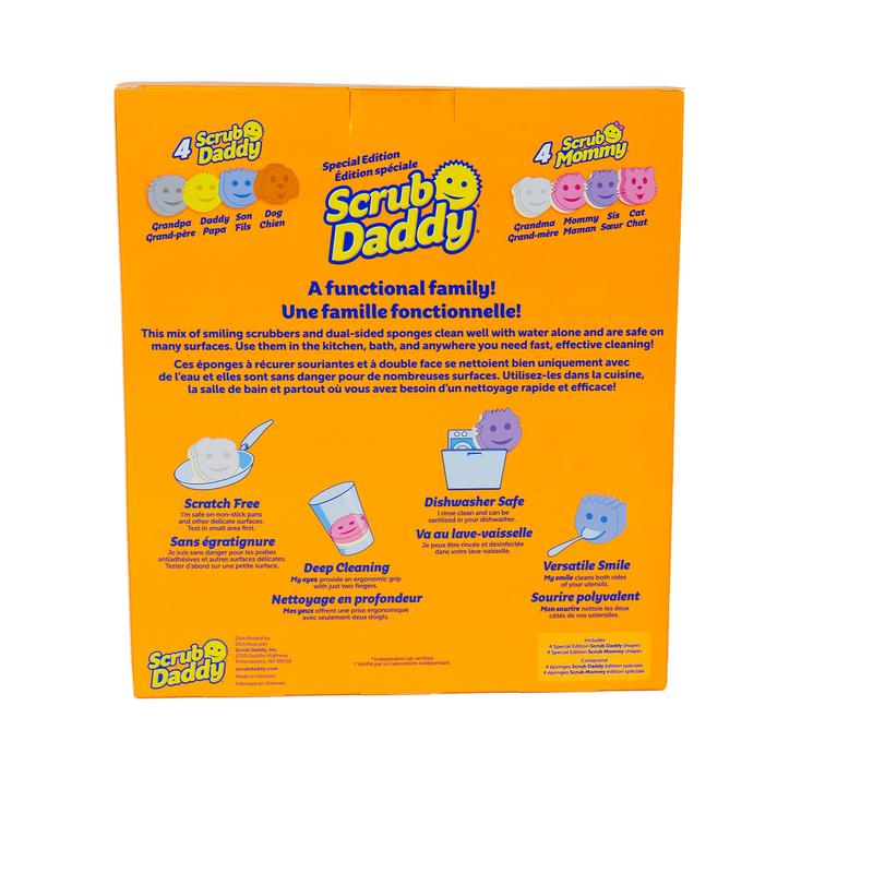 This mix of smiling scrubbers and dual-sided sponges clean well with water alone and are safe on many surfaces. Use them in the kitchen, bath, and anywhere you need fast, effective cleaning! Each box includes 4 Scrub Daddys - 1 Grey Grandpa, 1 Yellow Daddy, 1 Blue Son, and 1 Orange Dog. 4 Scrub Mommys - 1 White Grandma, 1 Pink Mommy, 1 Purple Sis, and 1 Pink Cat.