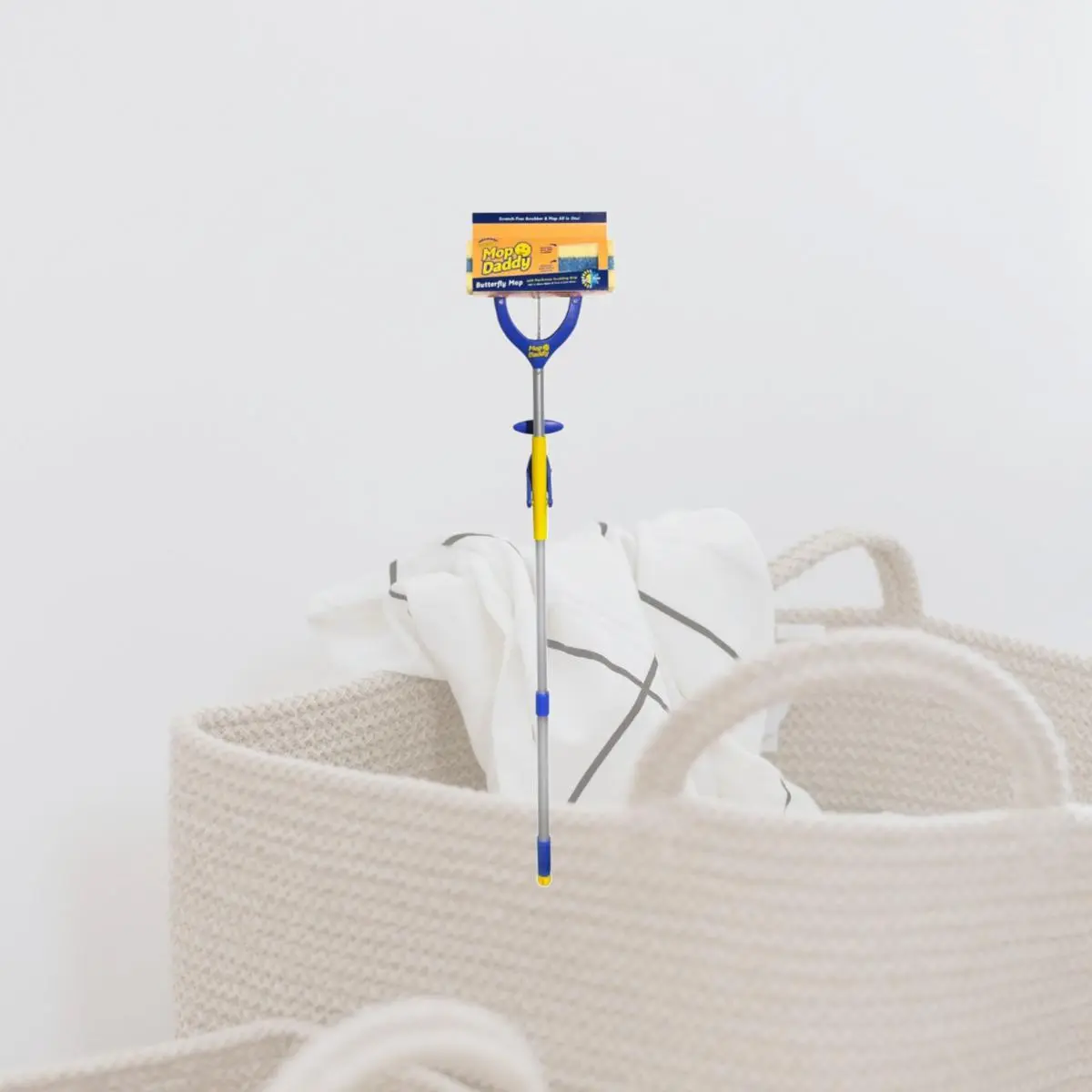 Scrub Daddy's Mop Daddy Butterfly Mop. Mop Daddy's head attaches by a simple hook and loop system, which is machine washable. Scrub Daddy's FlexTexture foam scrubs dirt and stuck-on stains. Our absorbent ResoFoam wipes floors clean and absorbs 60% more liquid than competitors, leaving floors dry and clean. Specifications Country of Origin: Vietnam. Weight: 1.5 lbs.