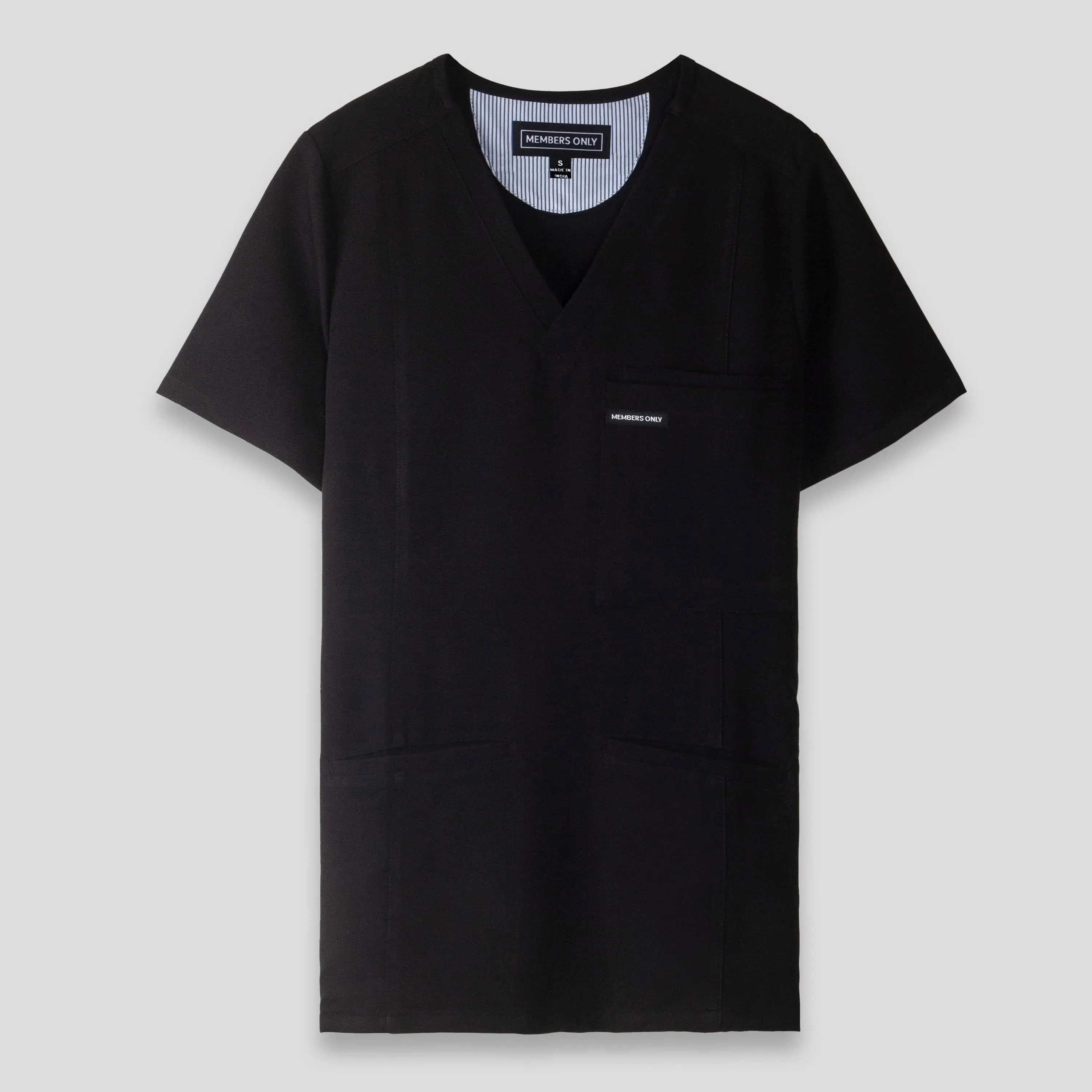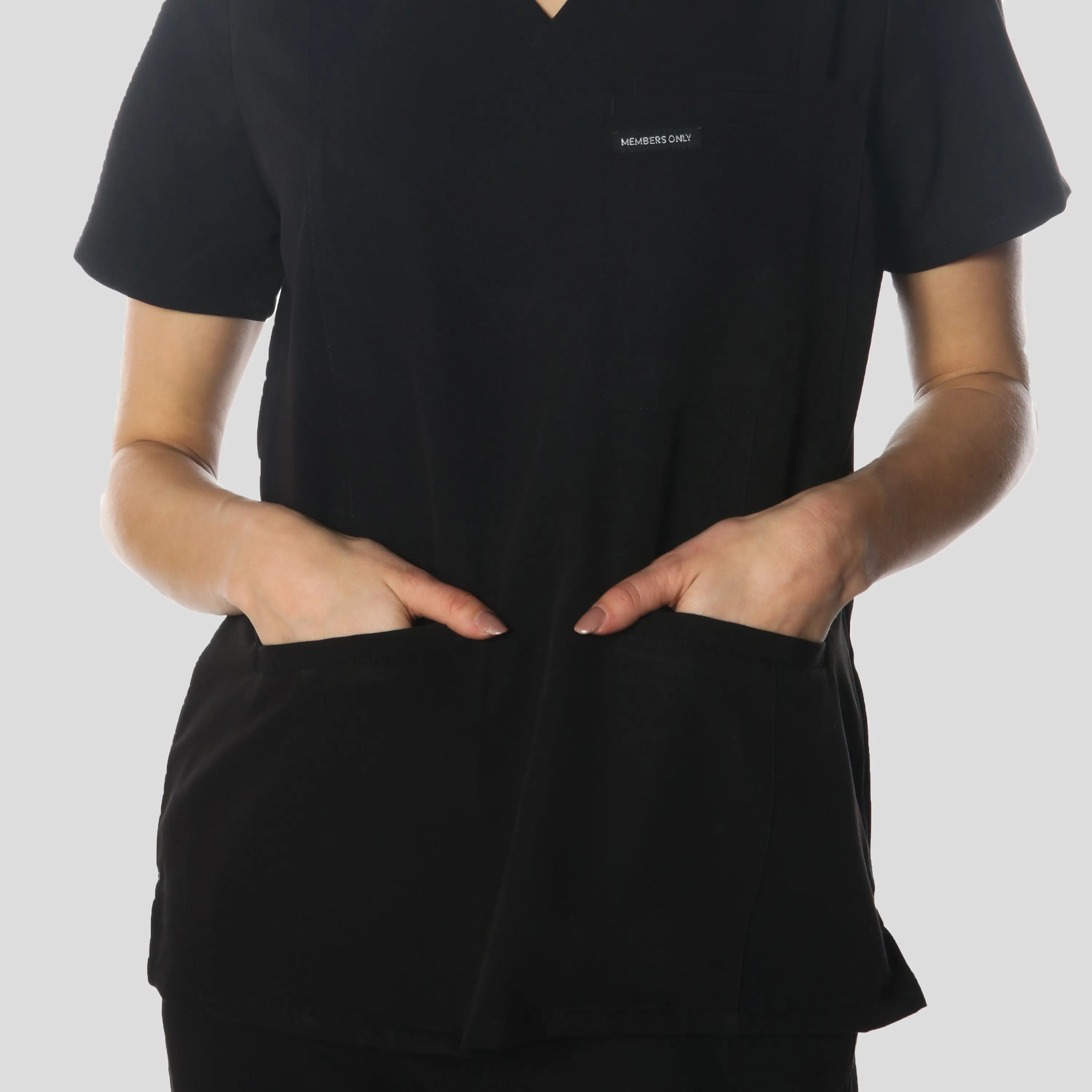 The top and the scrub bottoms fit so well on my petite frame. Usually I have to fold or get scrubs tailored because I am not a fan of the fits, but membersonly scrub and bottoms have fit amazing, super flattering with no need for me to make any additional adjustments. I just tuck in my scrub top and wear my scrub bottoms over it and the length fits great. I still have access to all the pockets. I ordered the teal pair and have gotten so many compliments since.