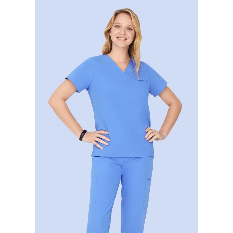 Crafted from a proprietary spill proof fabric this scrub top has a welt pocket.