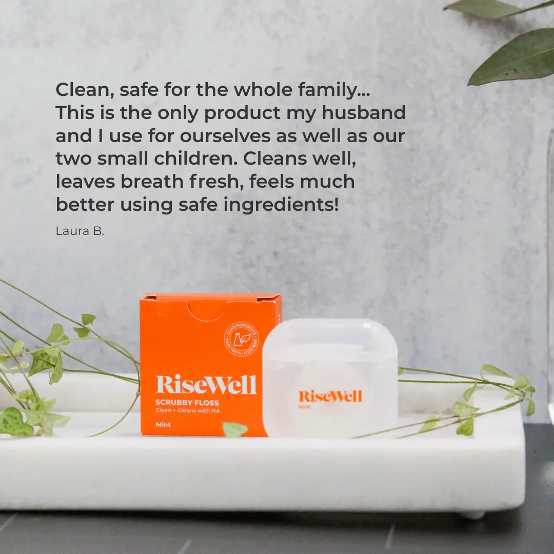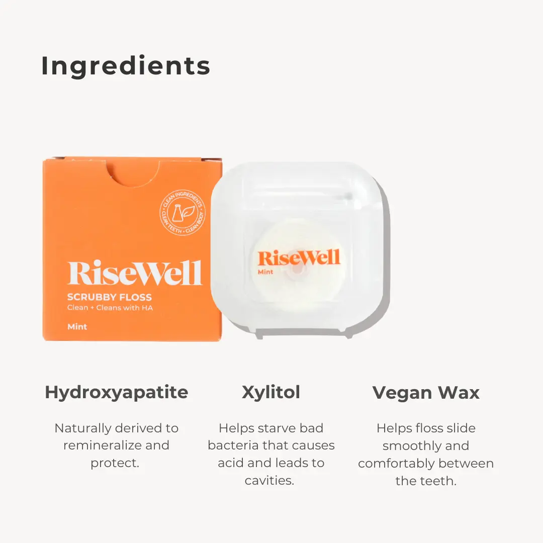 Flossing should feel good - simple as that. Our one of a kind, scrubby floss, is uniquely infused with hydroxyapatite to deliver remineralizing HA to the tough to reach spots between your teeth. Scrubby floss glides smoothly and comfortably between your teeth for optimal cleaning. And because transparency matters, all of our clean, effective ingredients are listed on the carton. We love showing you the good stuff inside!