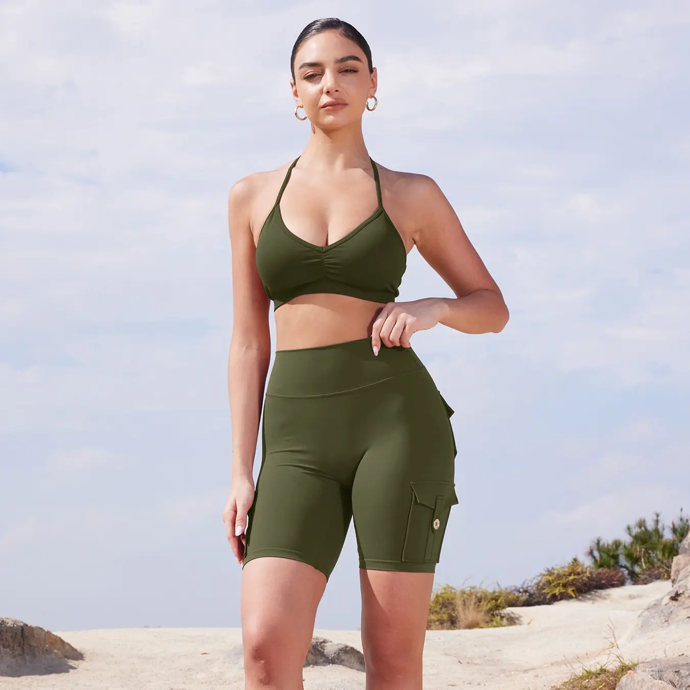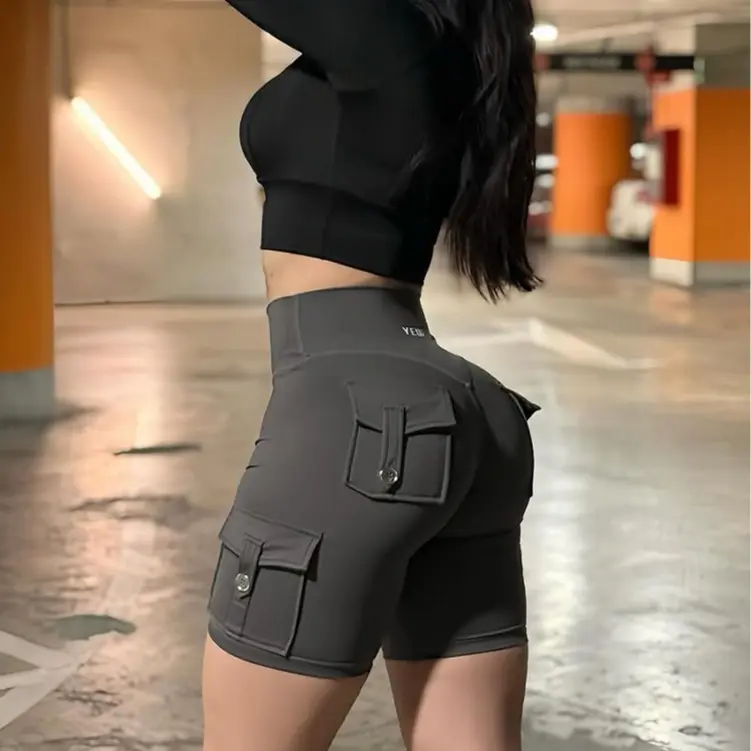 These biker shorts are crafted from 75% Nylon and 25% Spandex, ensuring flexibility and comfort. They run small; size up for a perfect fit. The design includes cute cargo pockets and a hidden scrunch feature for a flattering silhouette. Ideal for squats, they offer shape without compromising on style.