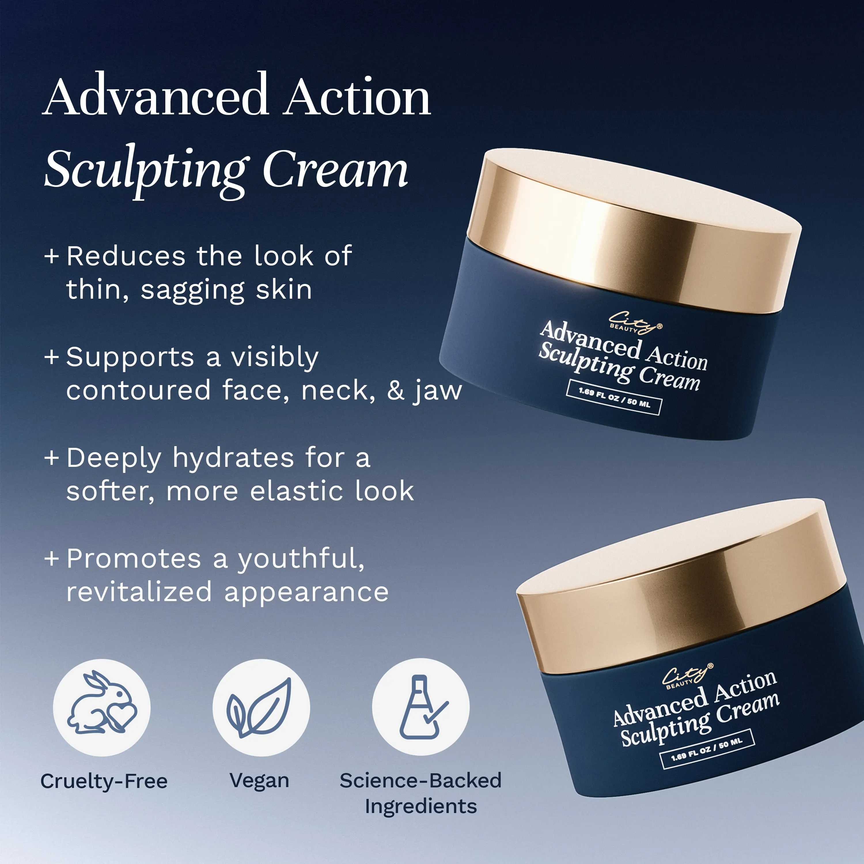 Advanced Action Sculpting Cream is a vegan face and neck cream that helps visibly improve the look of loose, sagging skin — especially around the jawline, neck, and cheeks. It’s designed to promote the appearance of firmer, smoother, more lifted-looking skin with a supple, refreshed feel.*