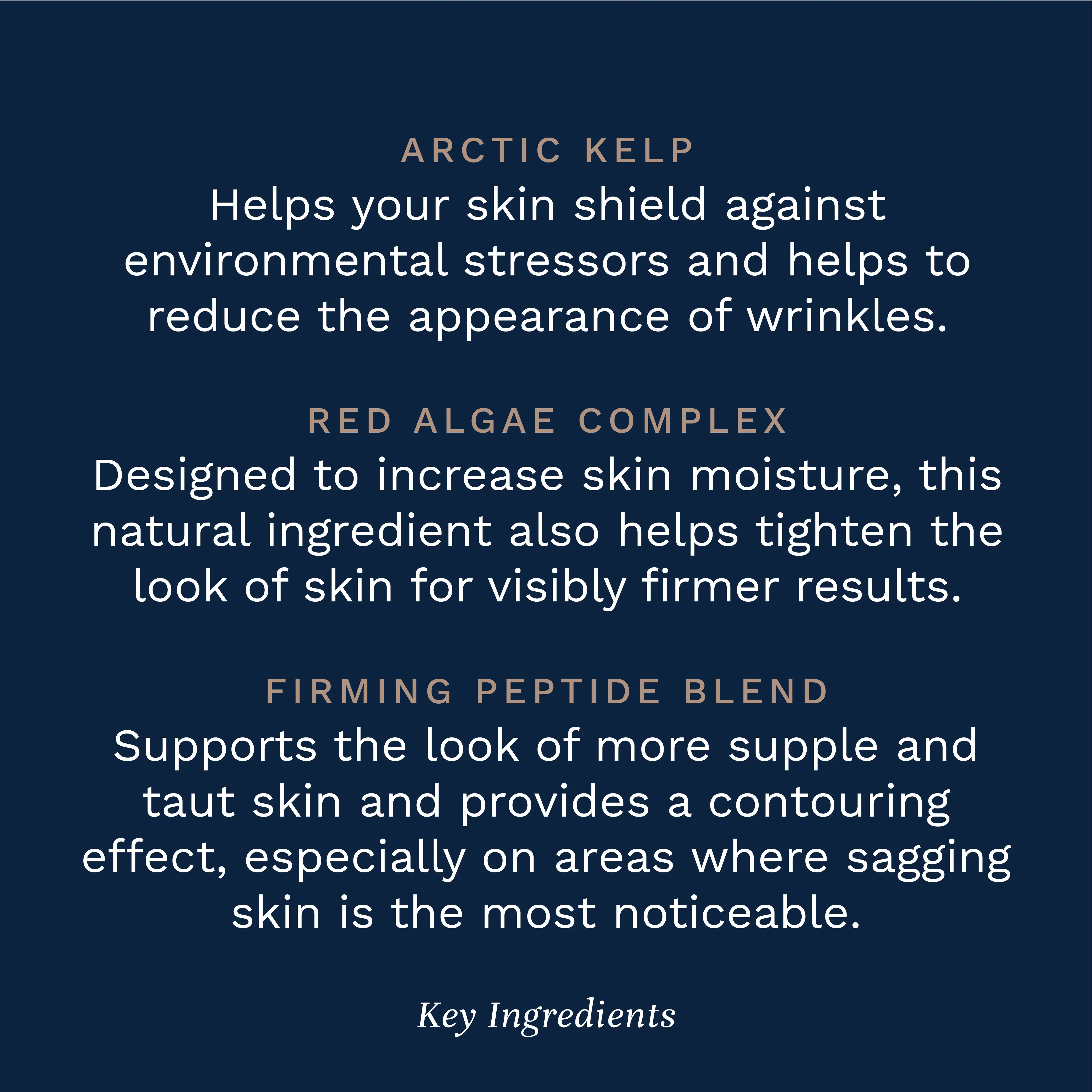 ·Arctic Kelp: Helps soften the appearance of wrinkles and reduce the visible effects of environmental stressors.