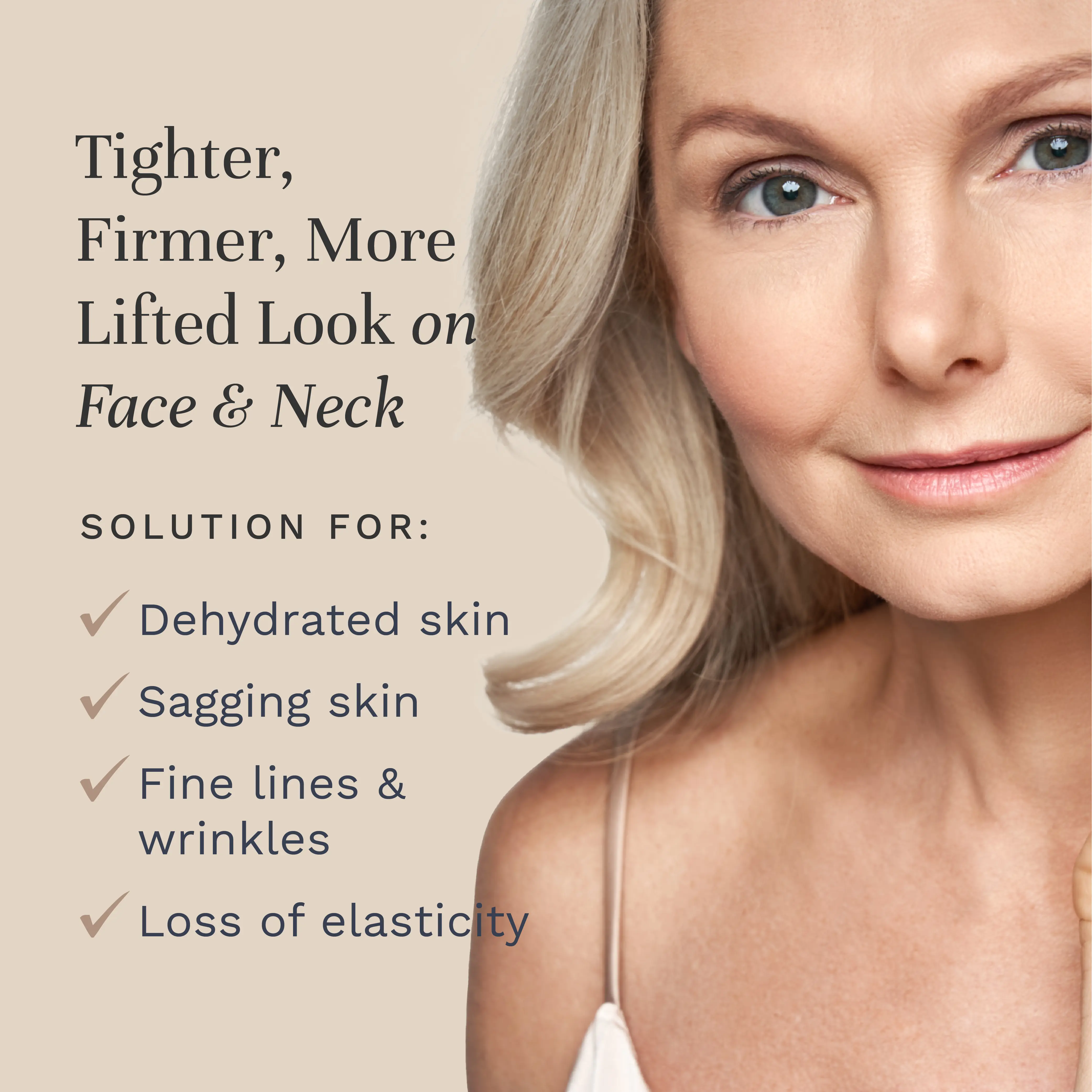 Sagging skin, dehydrated skin, fine lines and wrinkles, loss of elasticity