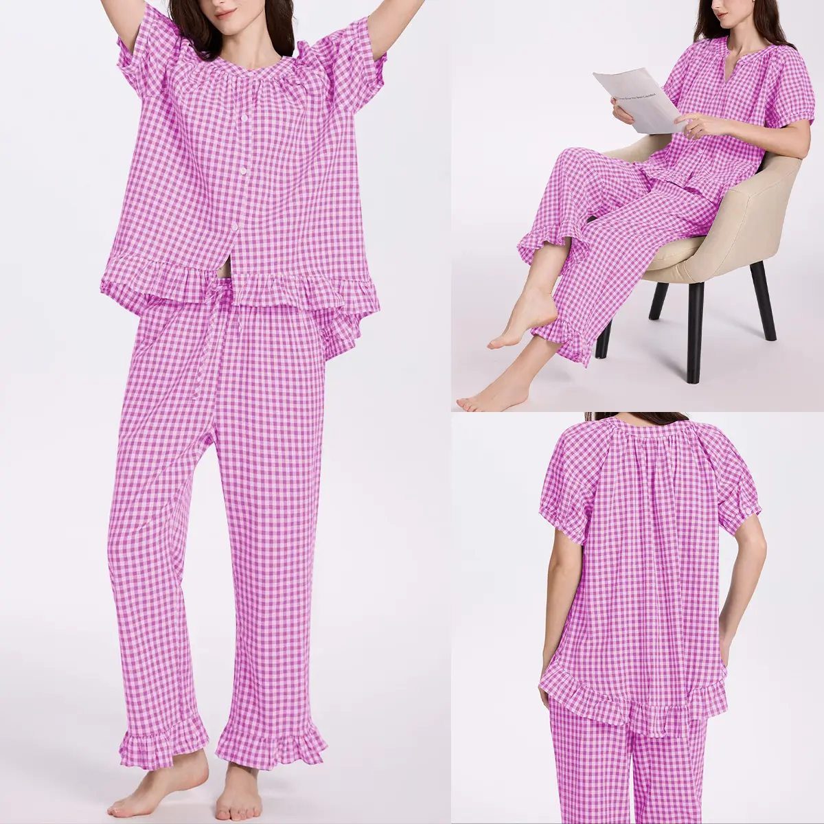 Features: 2-piece ruffle-trimmed set; the button-up top features puffy gathered sleeves and a crew neck; flowy cropped pants with side pockets and an elastic drawstring waist for a flexible fit.