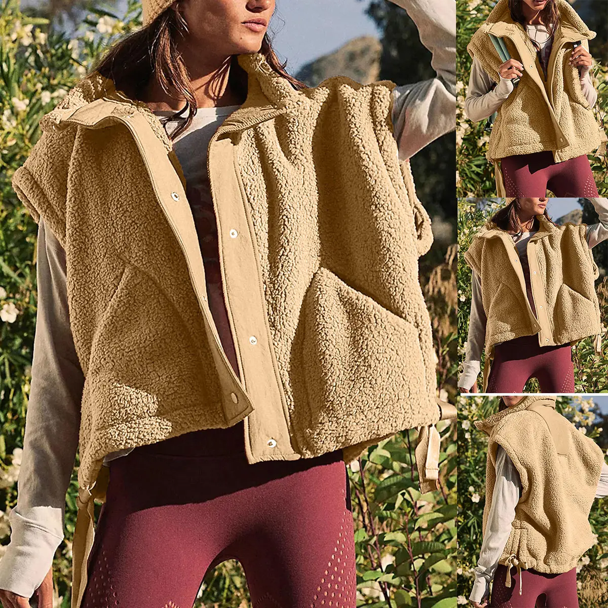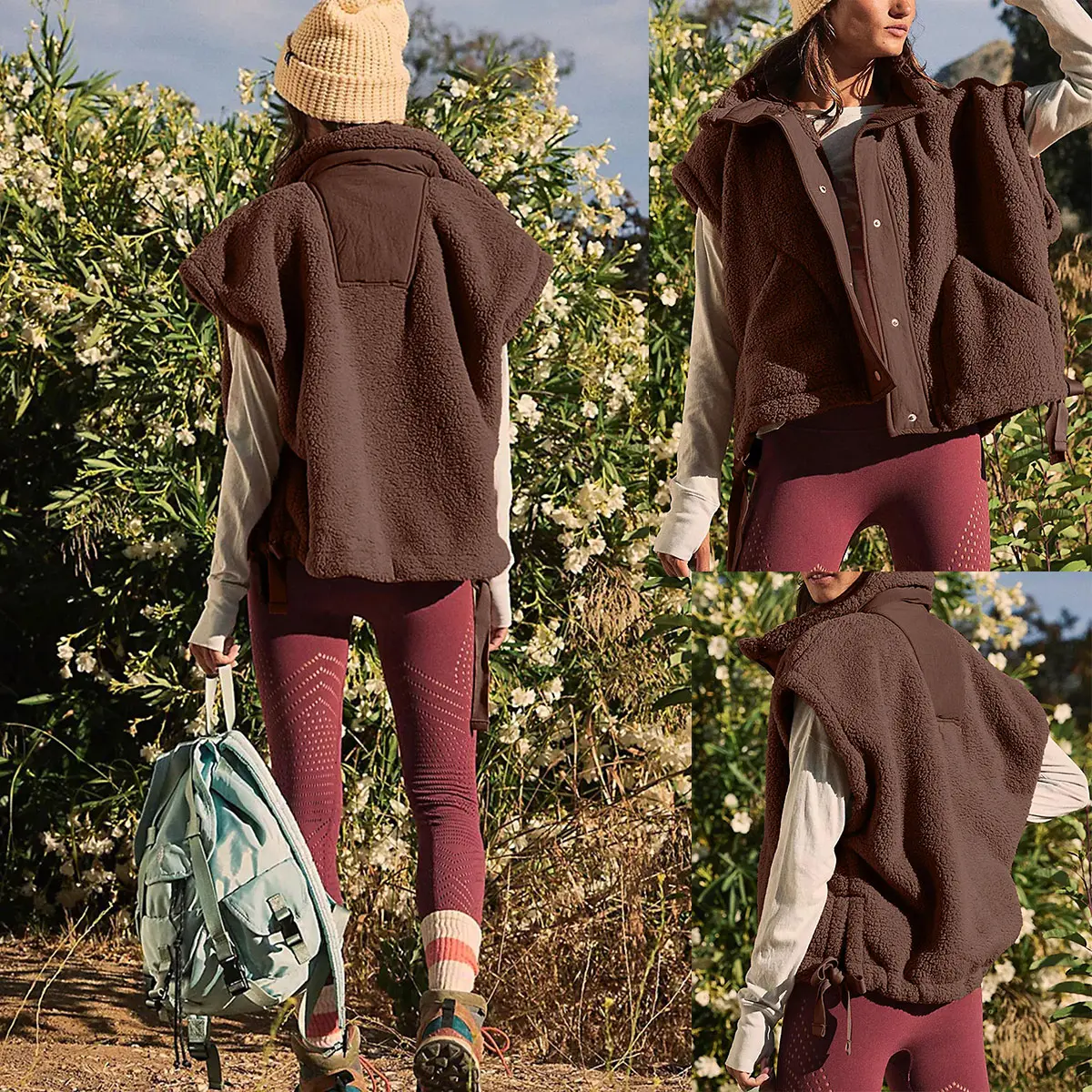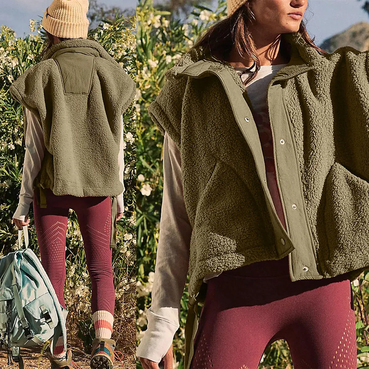 Features: button front, funnel neck, sleeveless, two sides big hand pockets, solid color adjustable drawstring hem, side split, nylon piecing design, stand up collar,loose fit fuzzy jackets