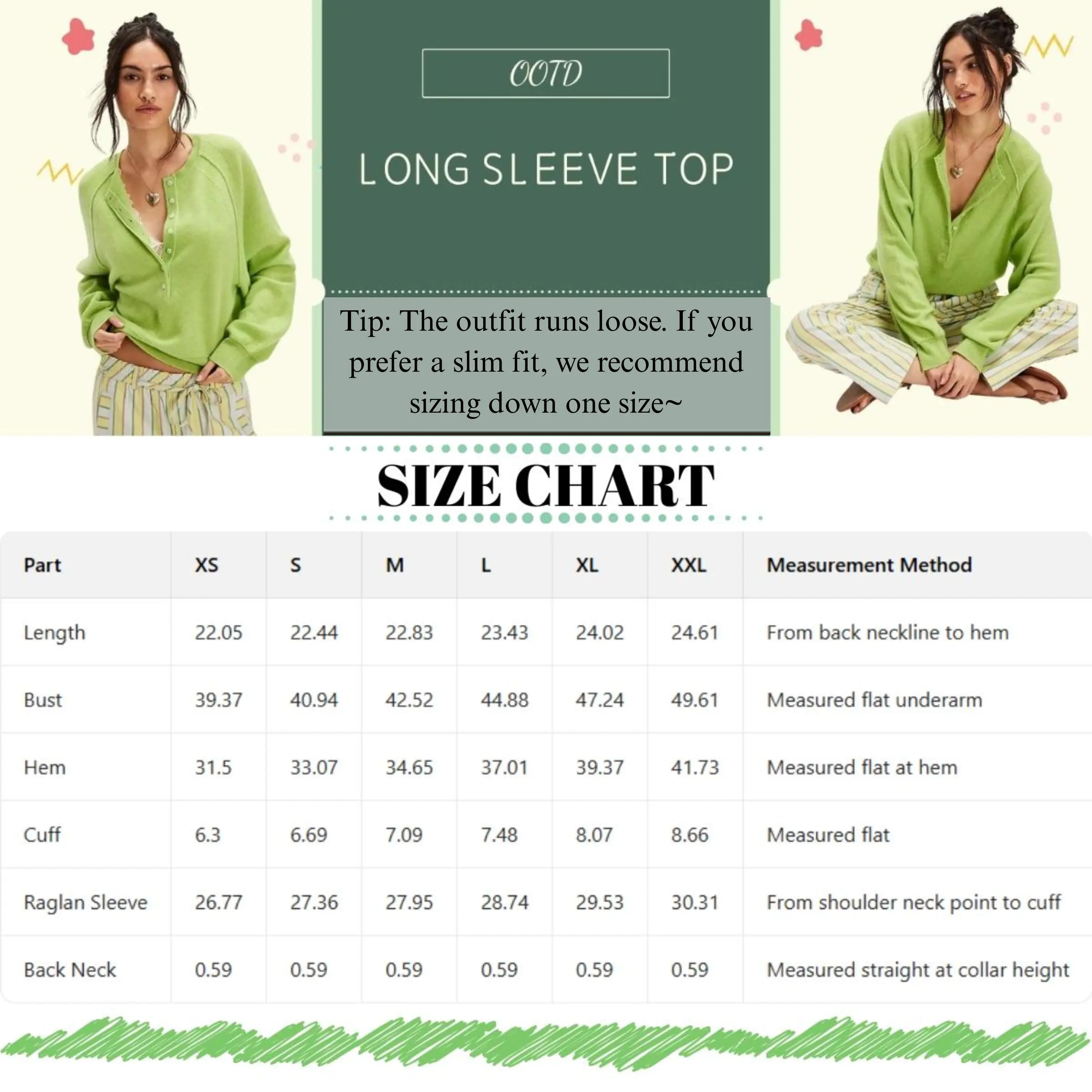 Made from high - quality, lightweight knitting material. It offers a soft and comfortable touch against the skin, making it ideal for all - day wear. The fabric has good breathability, ensuring you stay cozy without feeling stuffy. We offer a full size range from XS to XXL, and the measurement method for each part is clearly shown for your reference.