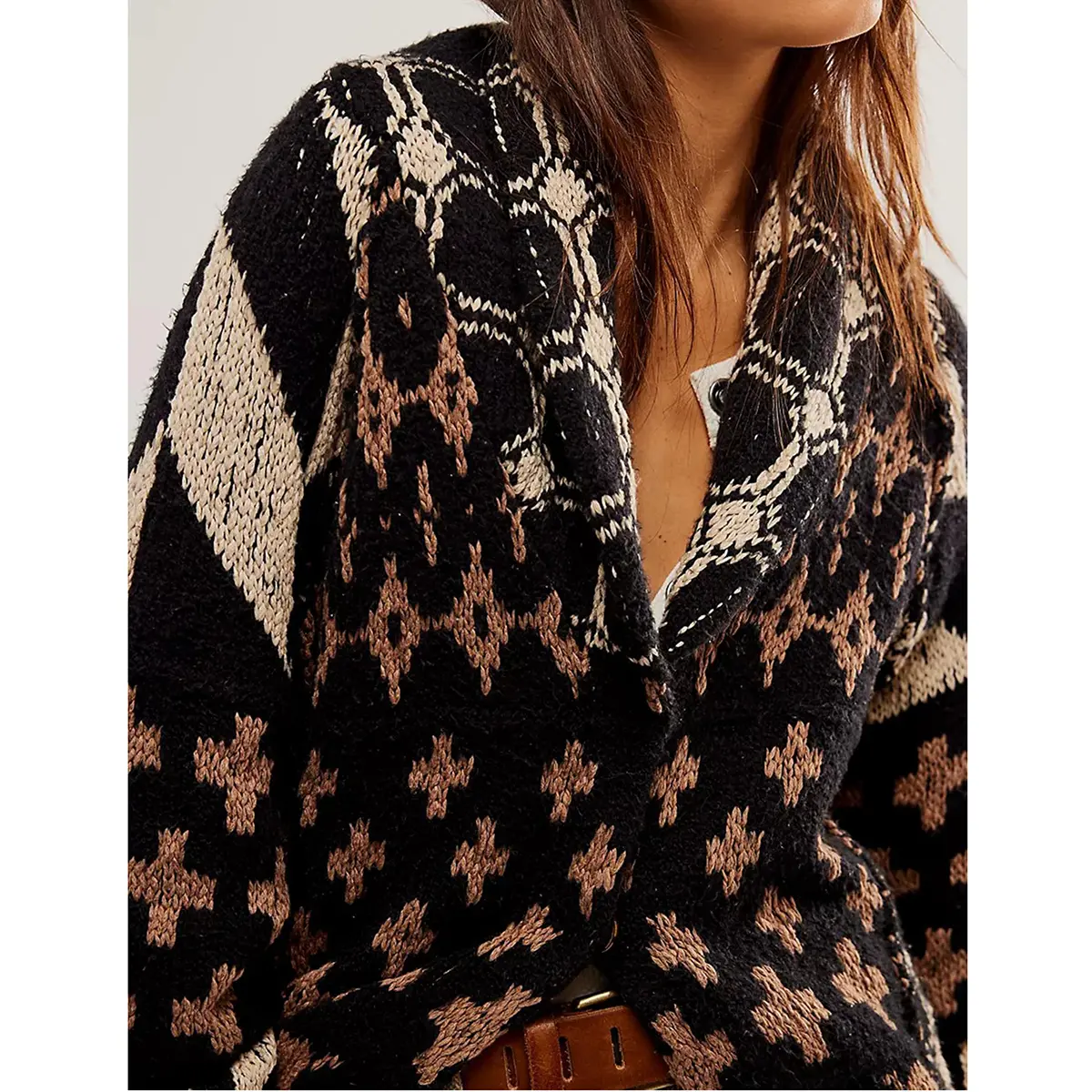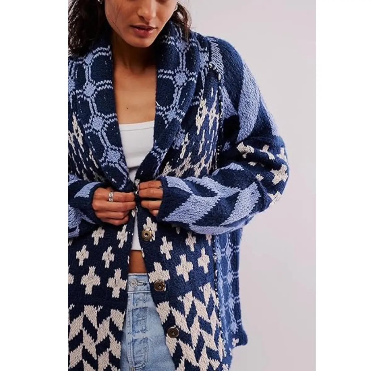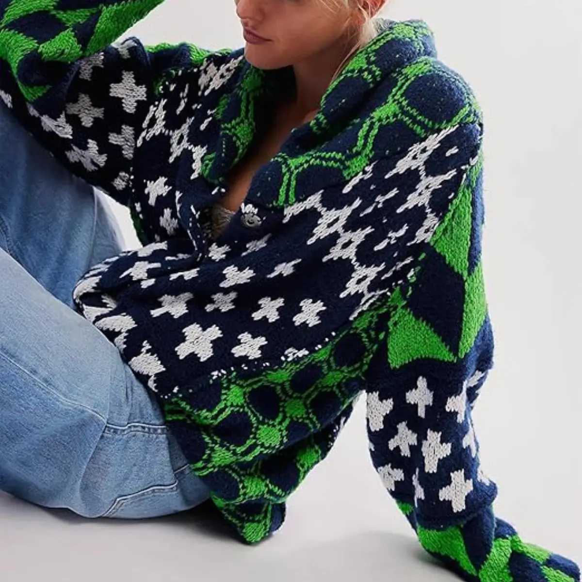 Our Graphic Sweater Cardigan features a trendy oversized Y2K print, bringing a sleek, retro-futuristic vibe to your fall wardrobe. The classic lapel design adds a casual street-style edge, making it easy to dress up or down.