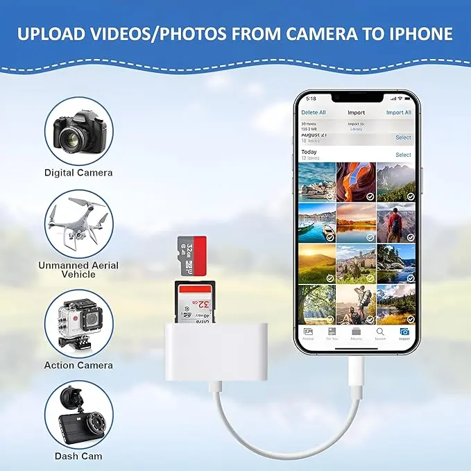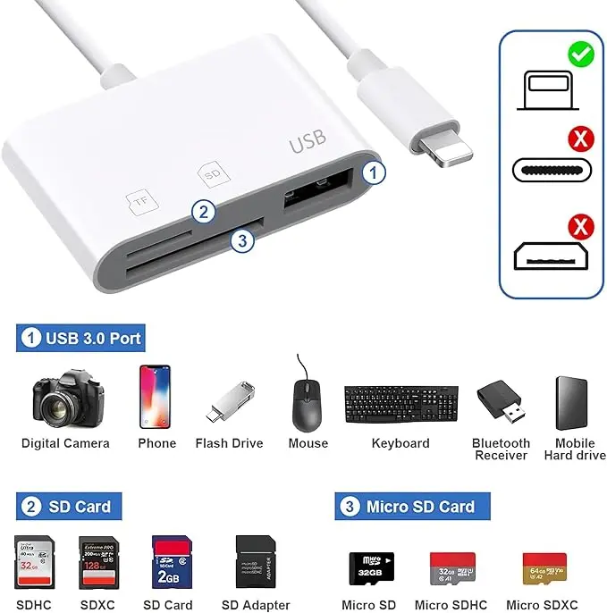 [Accessories for iPhone with Dual Card Slots]: This Memory Card Reader for iPhone supports SD Card and TF Card, Secure Digital (Standard SD/SDHC) and Micro SD(TF) card. Do NOT Support Wi-Fi SD Memory card.