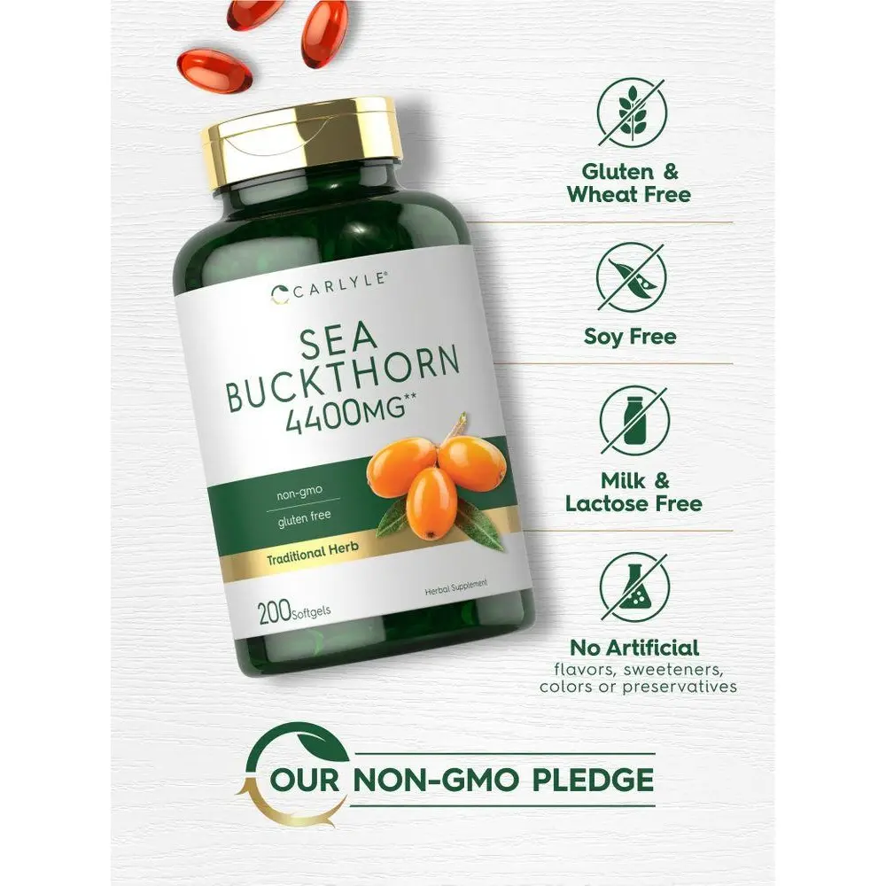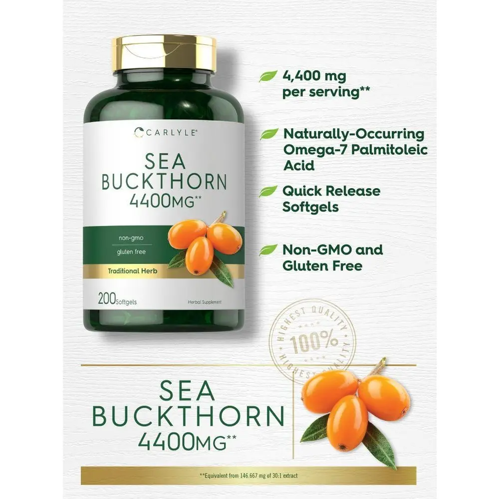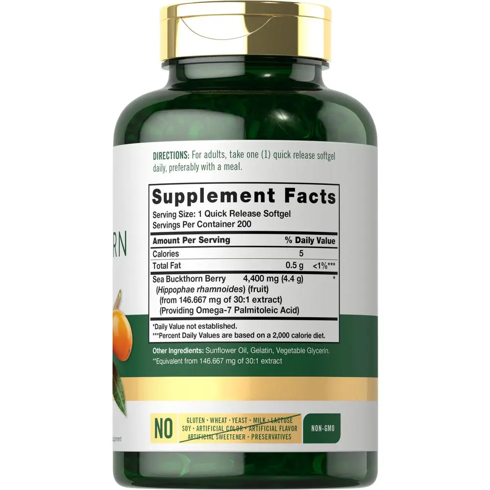 Our premium, potent formula provides the equivalent of 4,400 mg of Sea Buckthorn per quick release softgel, a source of naturally occurring Omega-7, Palmitoleic Acid.** This traditional herbal supplement is gluten free and non-GMO, making it perfect for adult men and women seeking a source of naturally occurring omegas. Complete your daily routine with our 200-softgel supply!