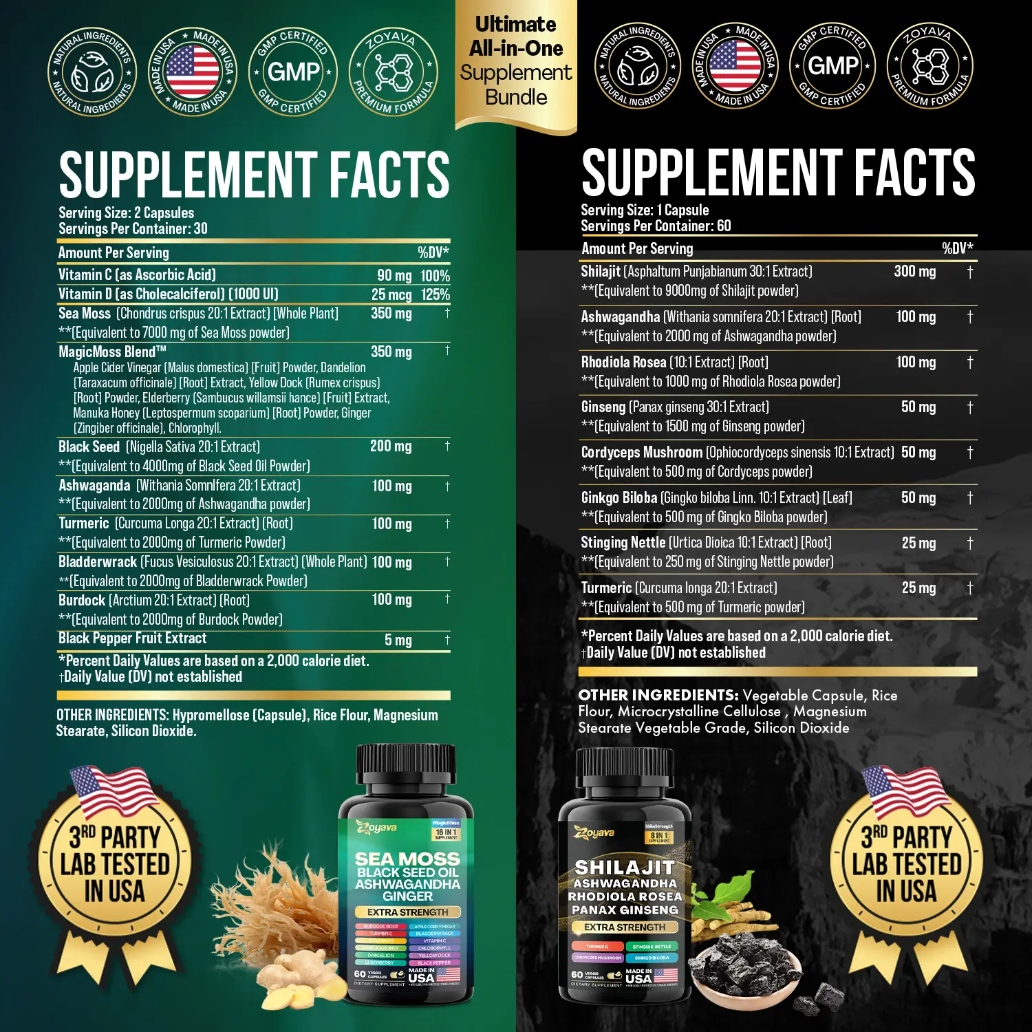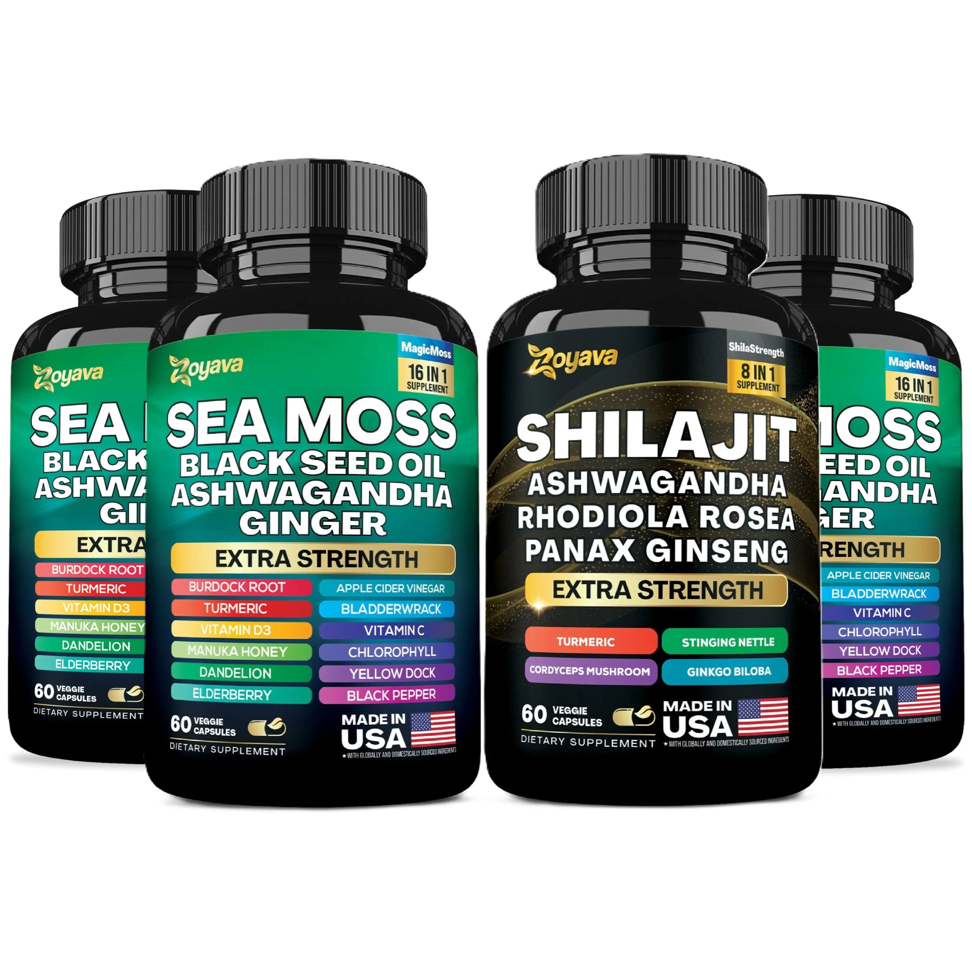 Dynamic Vitality Bundle Extra Plus combines Zoyava Sea Moss (180 capsules) and Shilajit (60 capsules). This all-in-one supplement offers a powerful blend of natural ingredients, exclusively made in the USA. It's perfect for maintaining a healthy lifestyle, providing essential nutrients for daily energy.