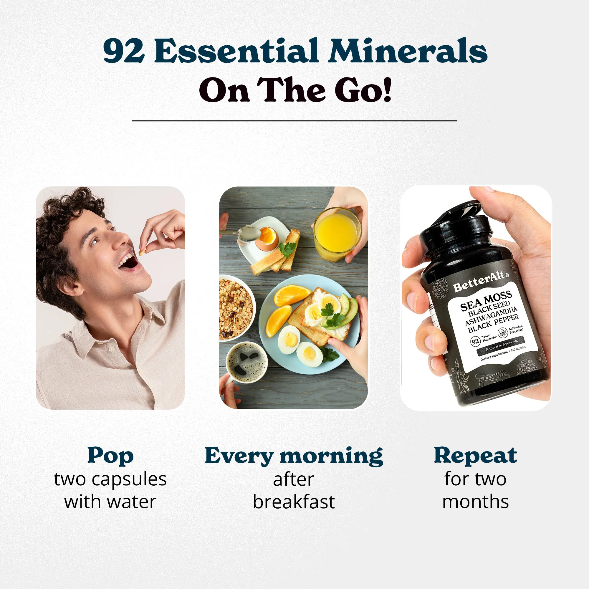 ·Packed with 92 essential minerals and nutrients, our Sea Moss Capsules help support your body's nutritional needs.