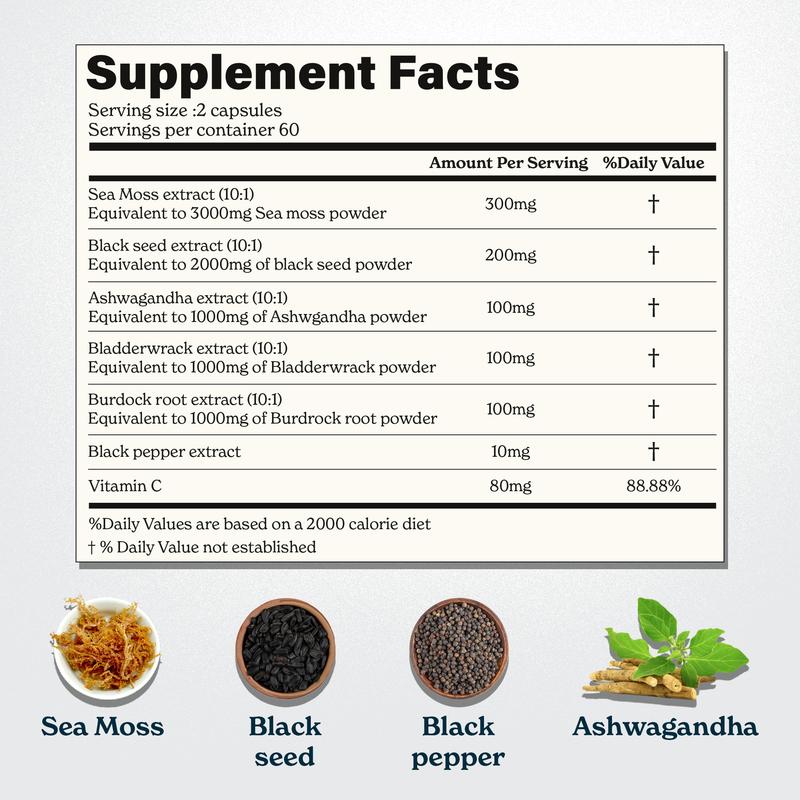 Primary Ingredients: Sea Moss, Black Seed, Ashwagandha, Black Pepper