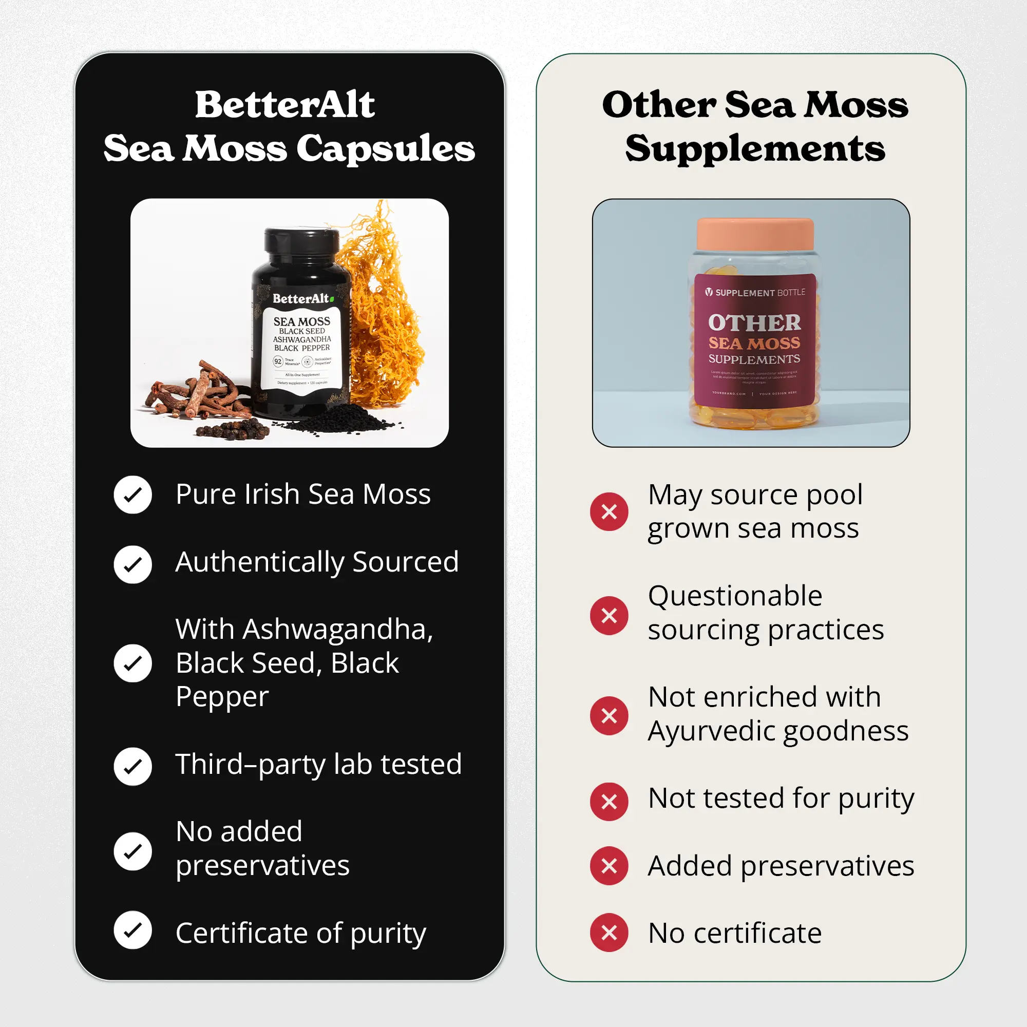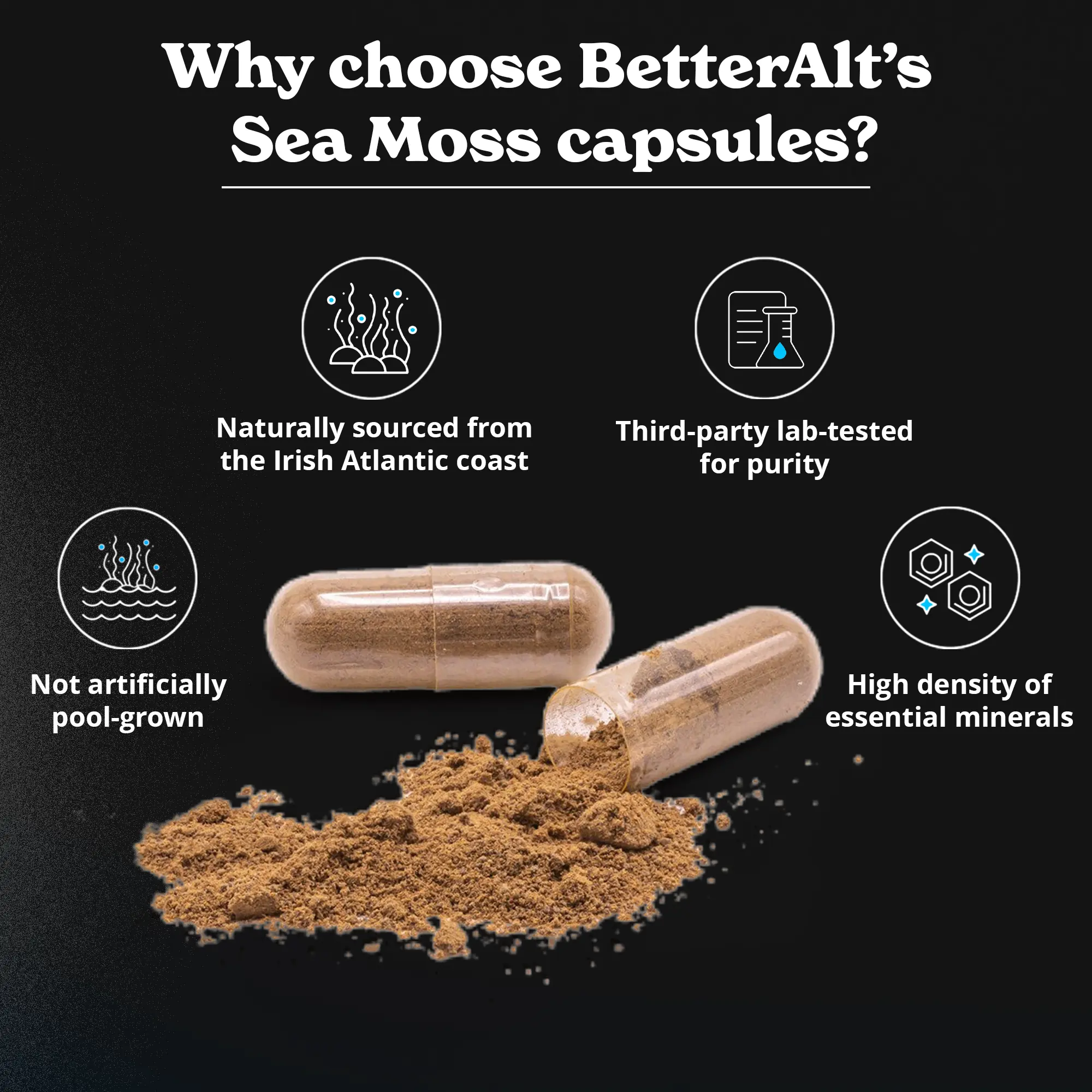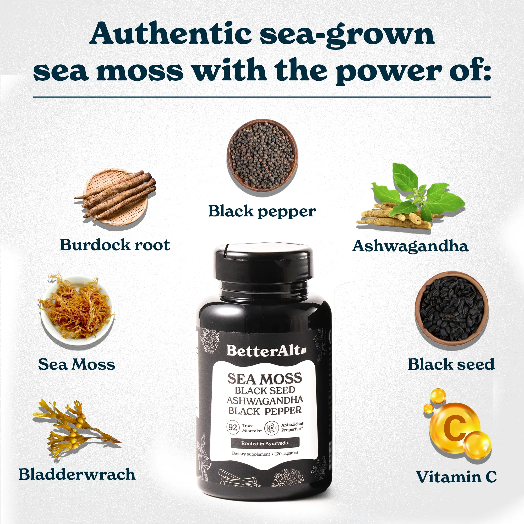BetterAlt Irish Sea Moss Capsules are enriched with Ayurvedic ingredients which help support immunity and promote gut health.