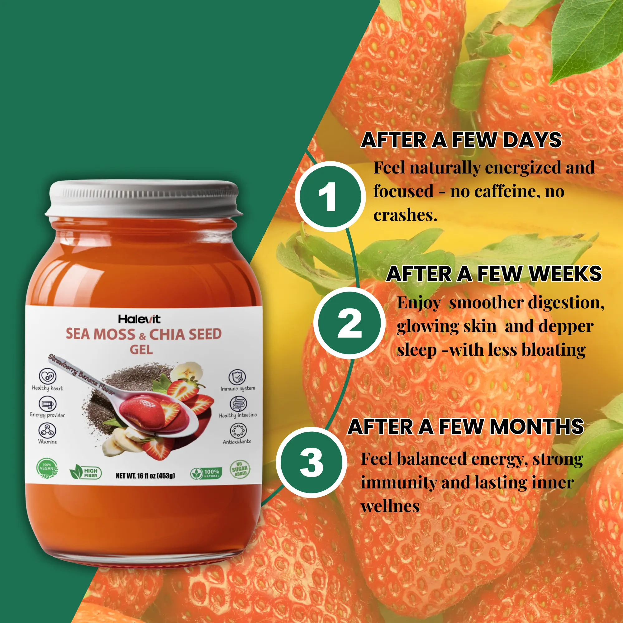 This smooth, ready-to-eat gel is crafted for easy daily consumption. No need to soak or blend—just enjoy it straight from the jar! Berry-infused with strawberries, blueberries, and raspberries, it offers a naturally refreshing wellness boost. Perfect for those seeking a convenient, nutrient-rich option.