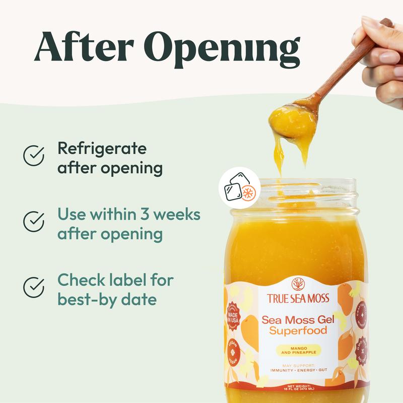 • Ingredients: Wildcrafted Irish Sea Moss, Black Seed Oil, Ashwagandha Root Extract, Ginger Root Extract, Vitamin C, natural mango flavor, purified water, monk fruit extract, and ascorbic acid.