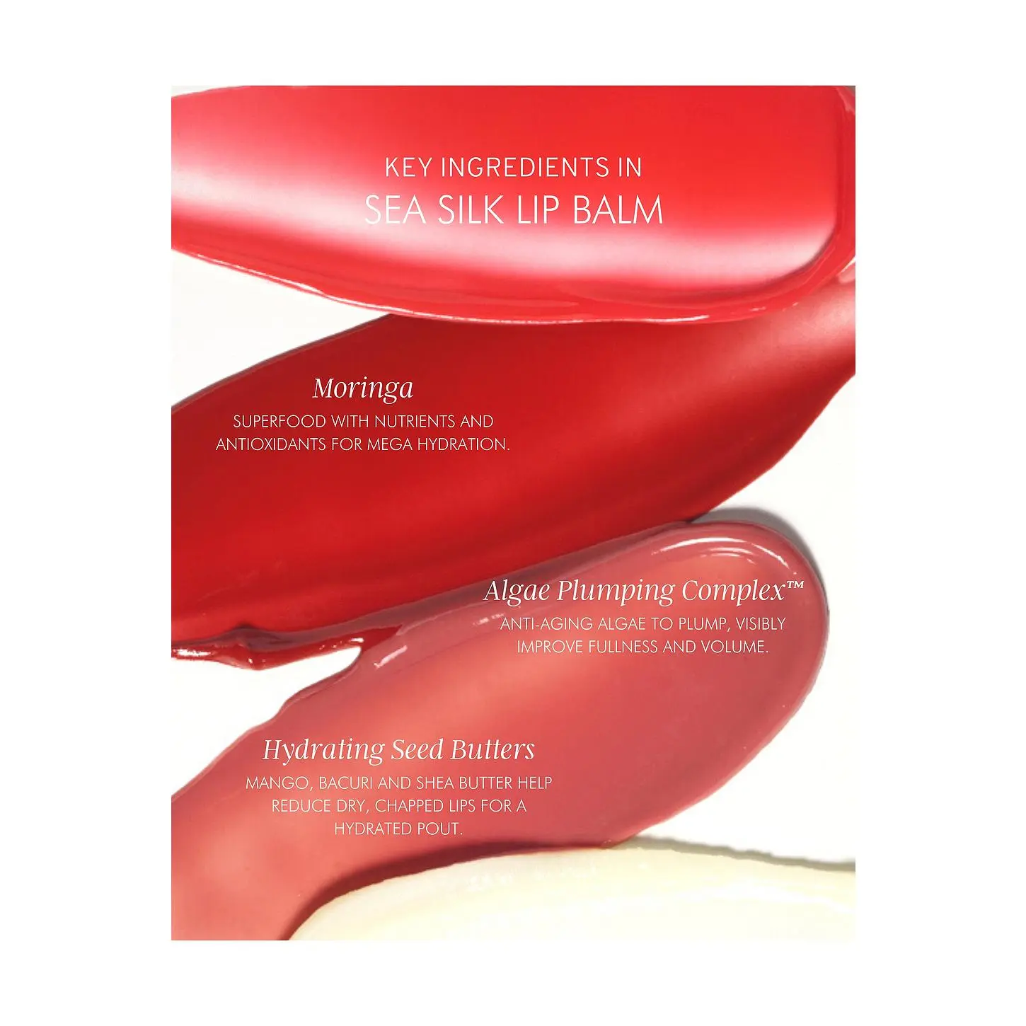 ·Drench your pout in our deliciously hydrating tinted Algae + Moringa® lip treatment to deeply moisturize, plump and soothe dry, chapped lips