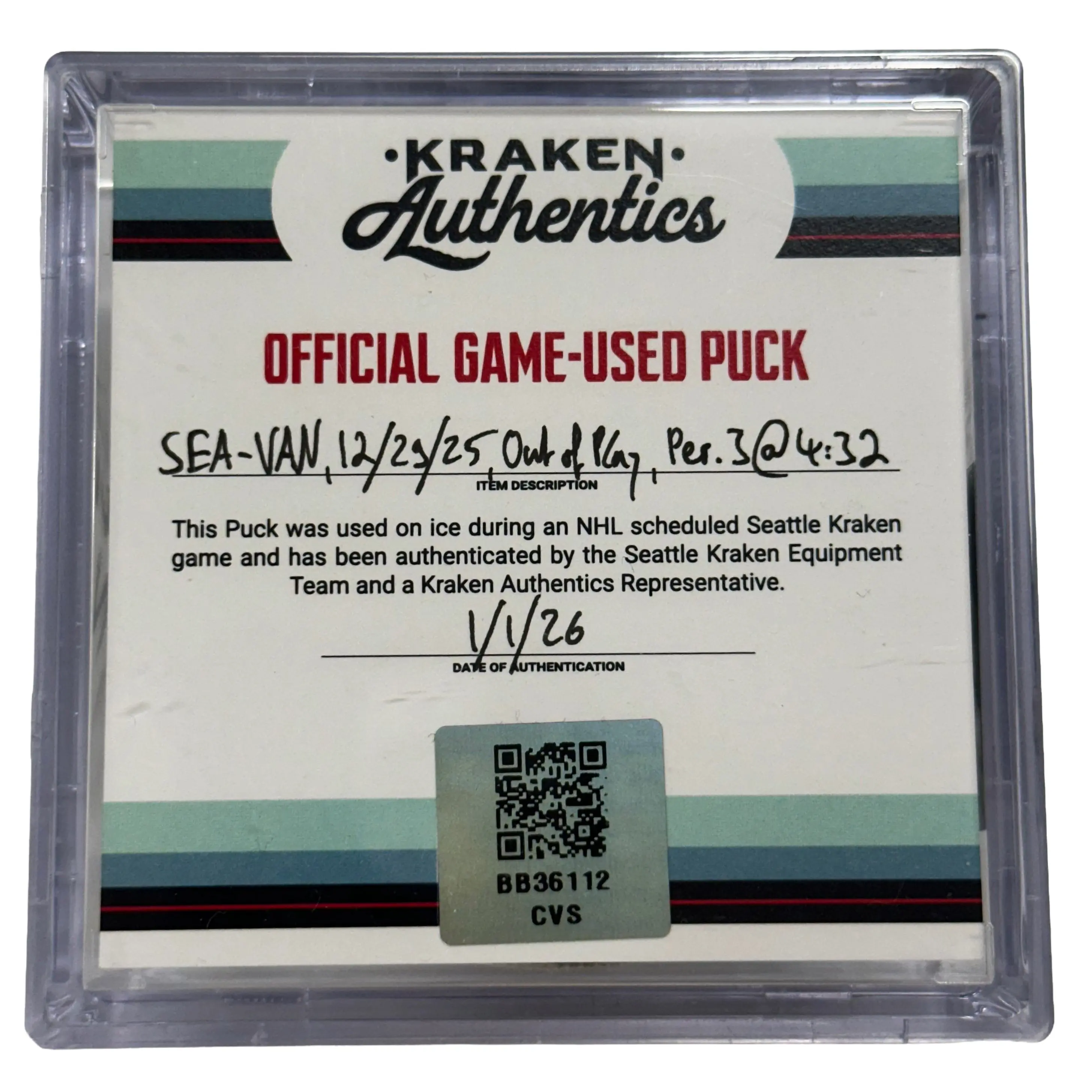 Official game-used puck from the Seattle Kraken vs. Vancouver Canucks game on December 29, 2025. The puck went out of play at 4:32 of the 3rd period and was retrieved directly from the ice.