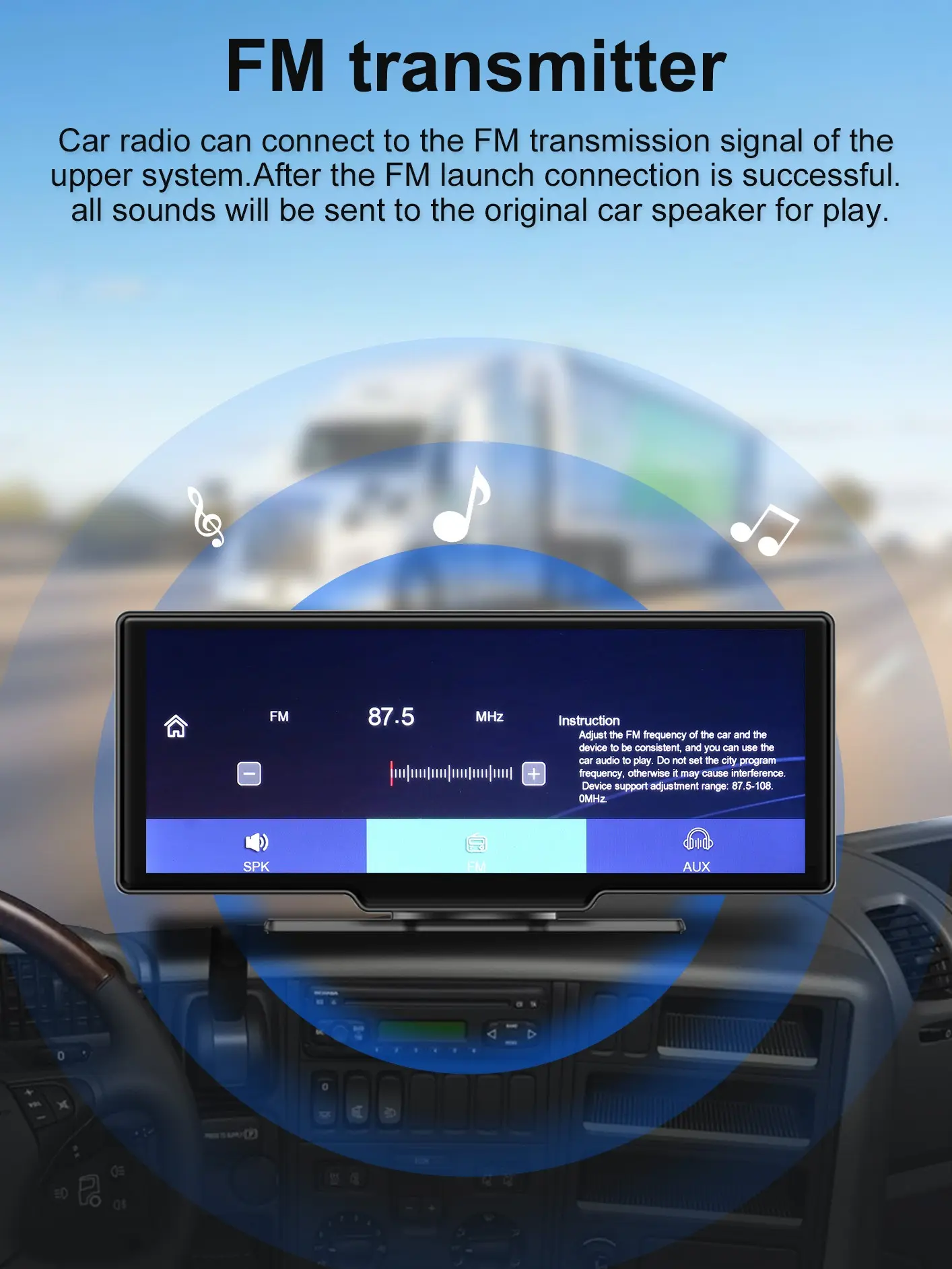 Audio output operates within the FM band, Audio out/BT-FM, with the default frequency set at 87.5MHz, adjustable via the + - buttons. It is advisable to select a frequency different from local broadcasts and synchronize the vehicle radio for an optimal audio experience. In both scenarios, adjust the volume on the screen or through the car volume control system, as the phone lacks this capability.