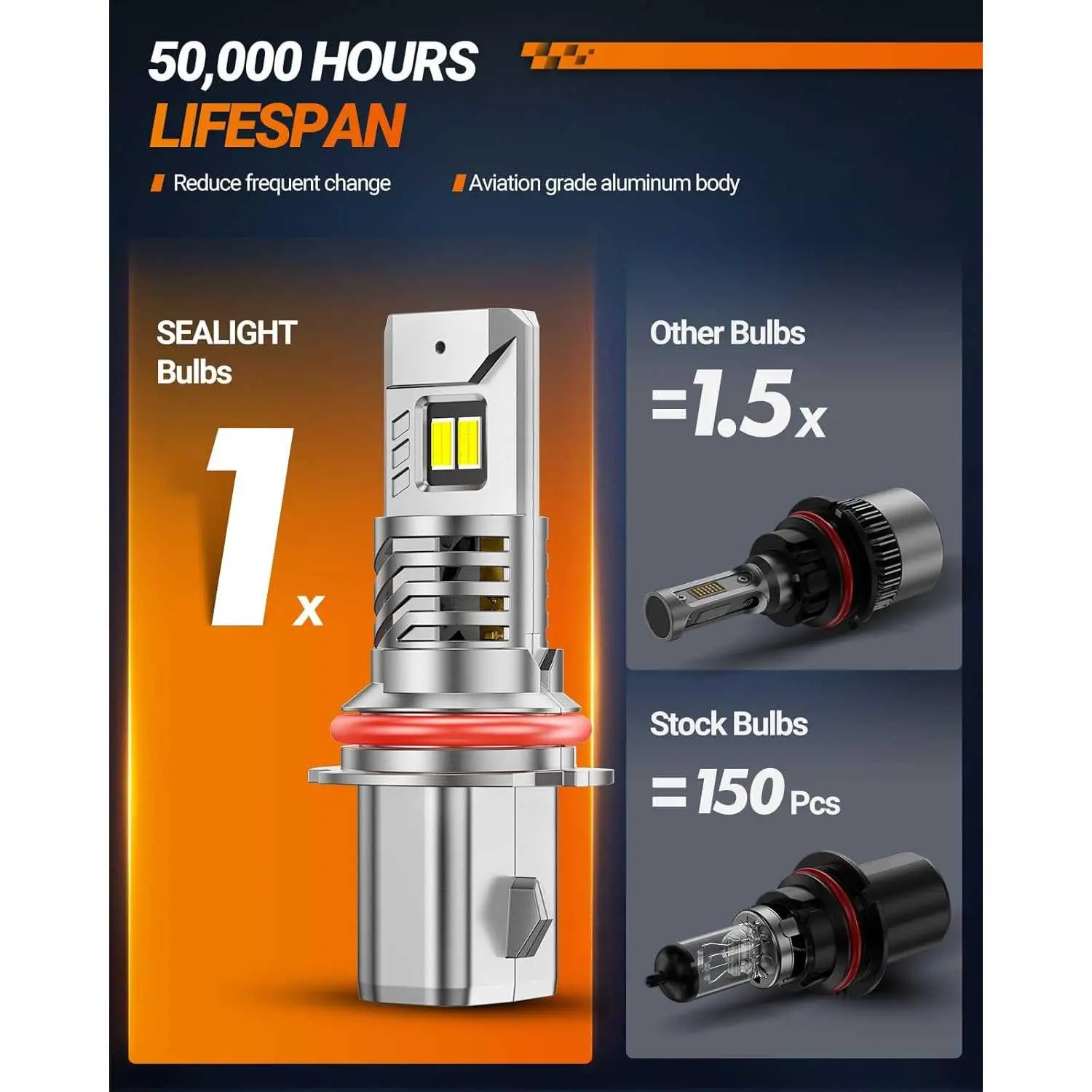 ·50,000 HOURS OF SERVICE LIFE: Not only designed with a 15,000PRM turbo fan, the SEALIGHT 9004 bulbs also feature an aluminum body and a distinctive hollow cooling, which extendind service life up to 50,000 hours