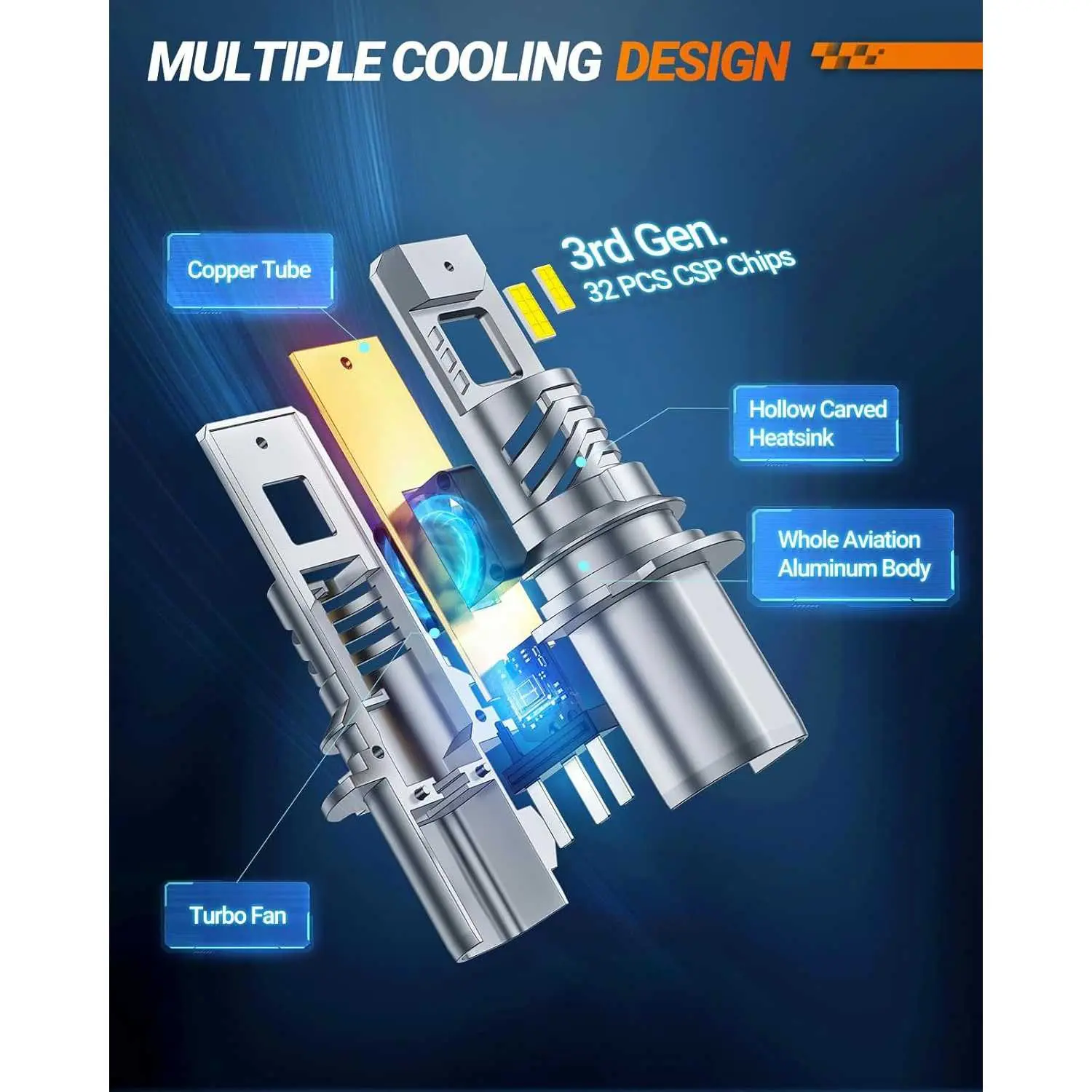 15000RPM turbo cooling fan can better help the bulbs to conduct heat include from top to bottom so that increase the service life of the light