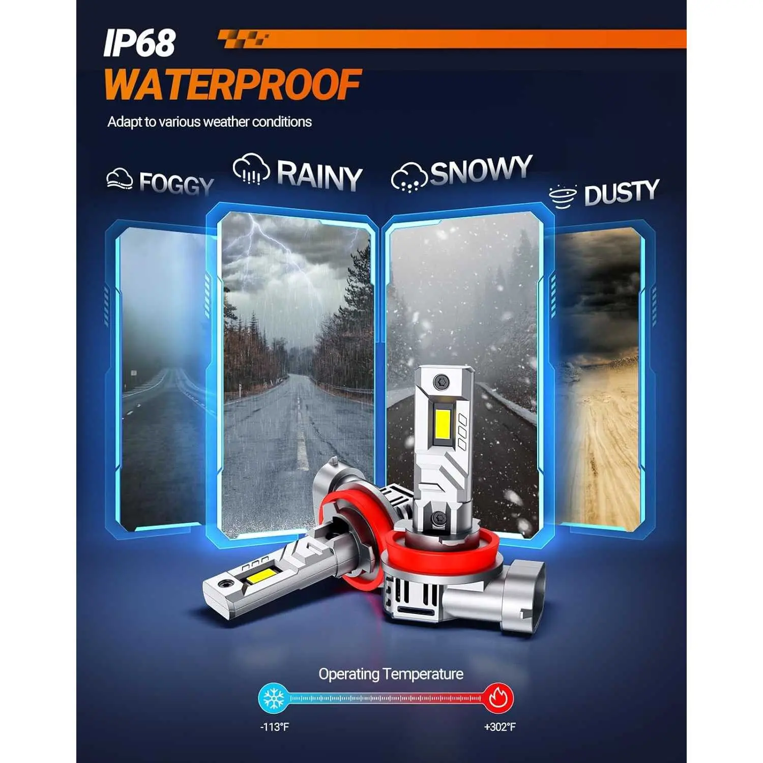 ·20-Year Lifetime: SEALIGHT H11 LED Headlight Bulbs Lifetime is 150 times longer than the stock bulbs because of utilizes an advanced 25,000RPM silent turbo fan and IP68 waterproof design allows the H8/H9 bulb to be used normally in blizzards or sandstorms