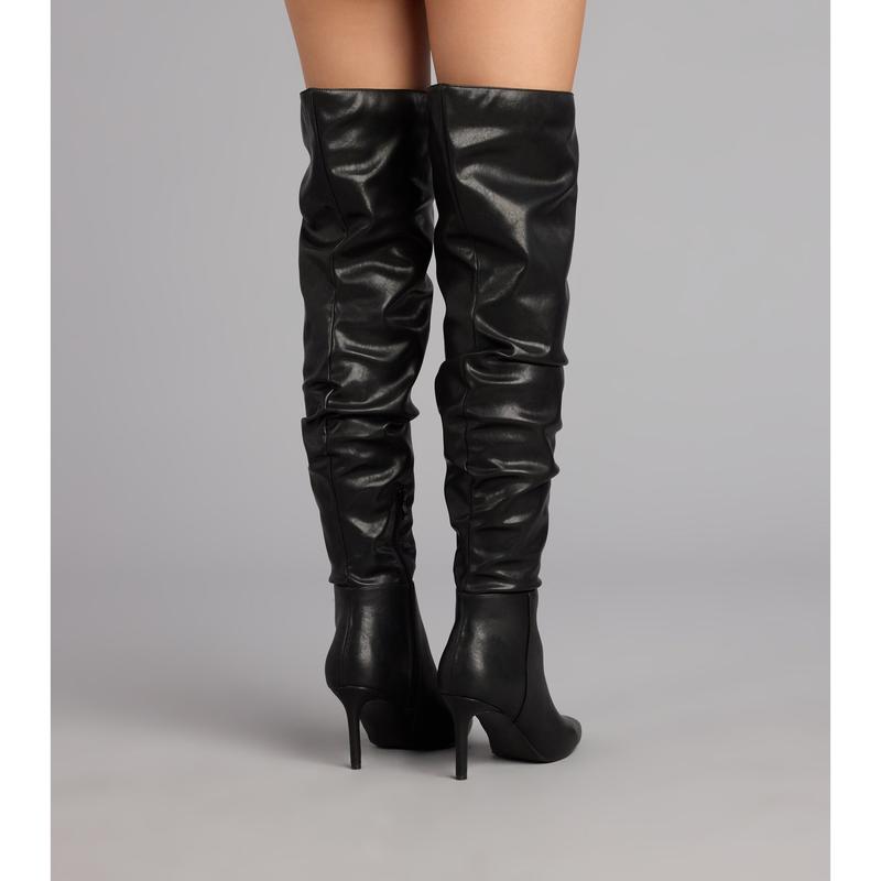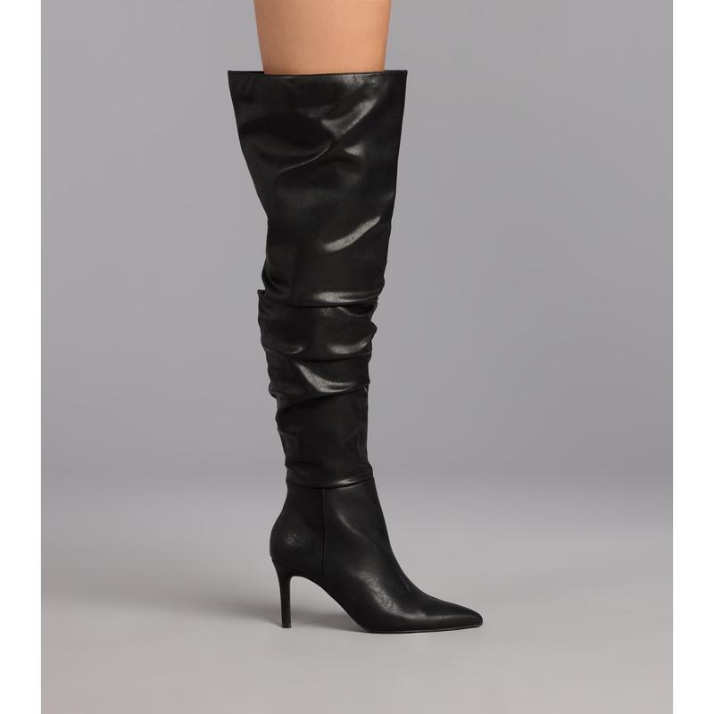 The definition of drama. These scrunch thigh-high boots strike the perfect balance of luxe and daring, with a pointed toe and sleek stiletto heel made to elevate all your fall outfits.