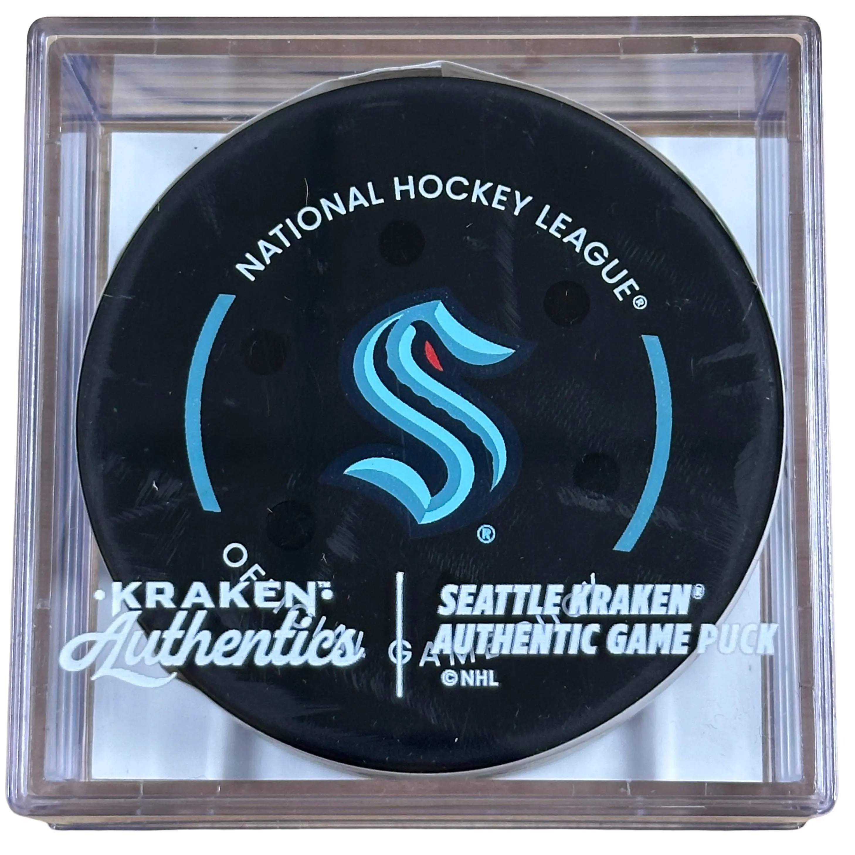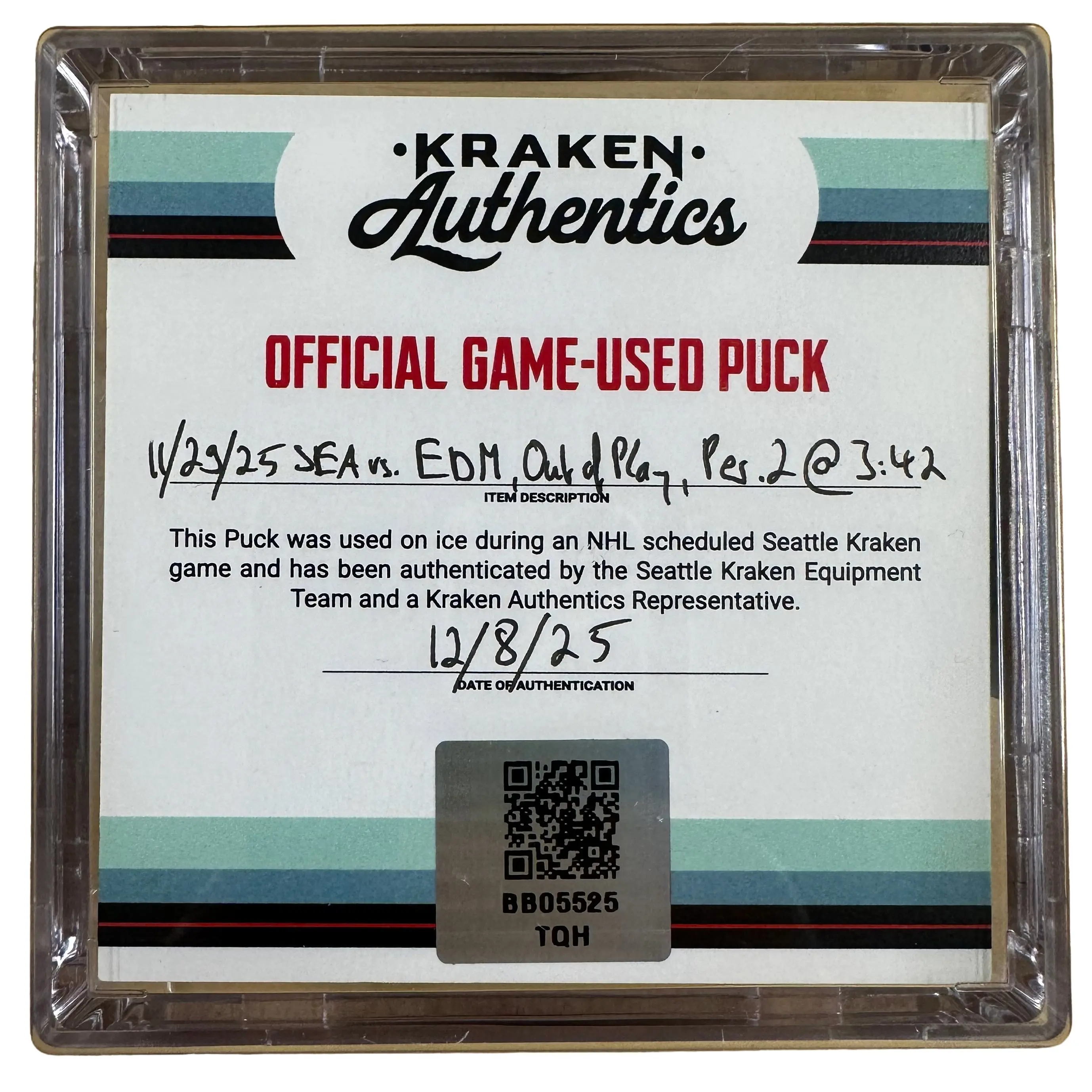 This is an official game-used puck from the Seattle Kraken vs. Edmonton Oilers game on November 29, 2025. This puck went out of play at 3:42 of the 2nd period and was retrieved directly from the ice.