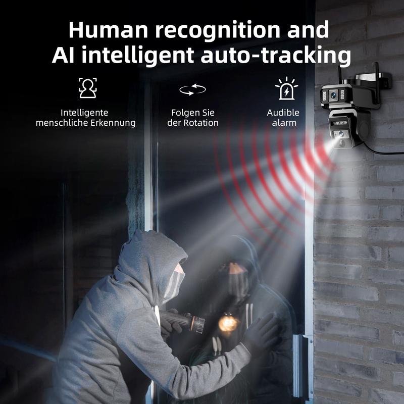 ăPIR Motion Detection with Al Analysis RecognitionăThis wireless outdoor camera with advanced smart Almotions detection, it can clear analysis and recognitionperson, vehicle, pet and package. The Al PlR sensor willbe triggered in real time once the outdoor securitycameras detect motion, at the same time, thenotification will be pushed to your phone via the app.Check the status of pets, prevent packages from beingstolen, and protect the safety of your family's property.