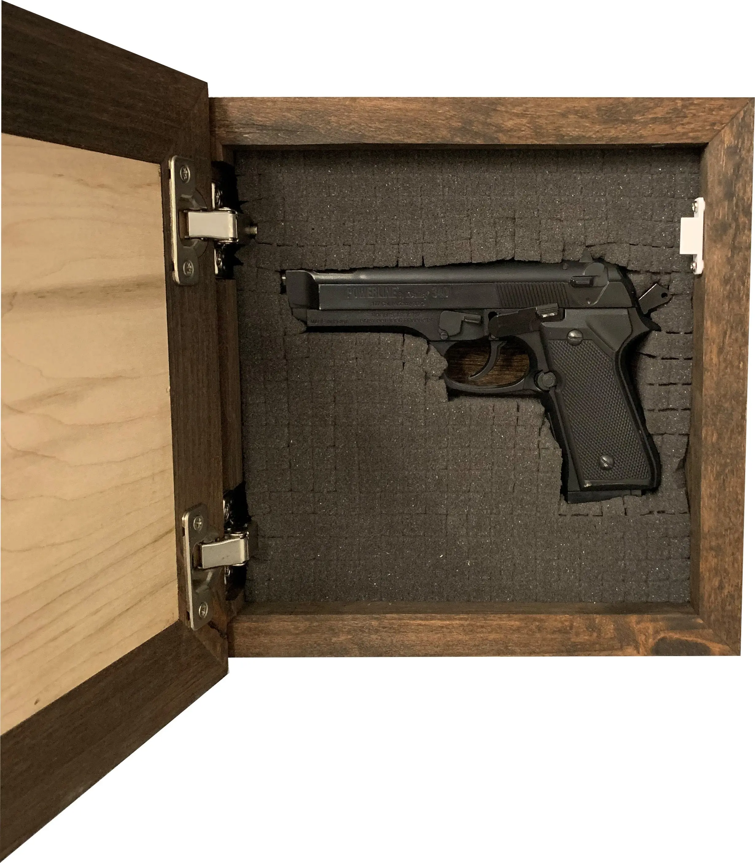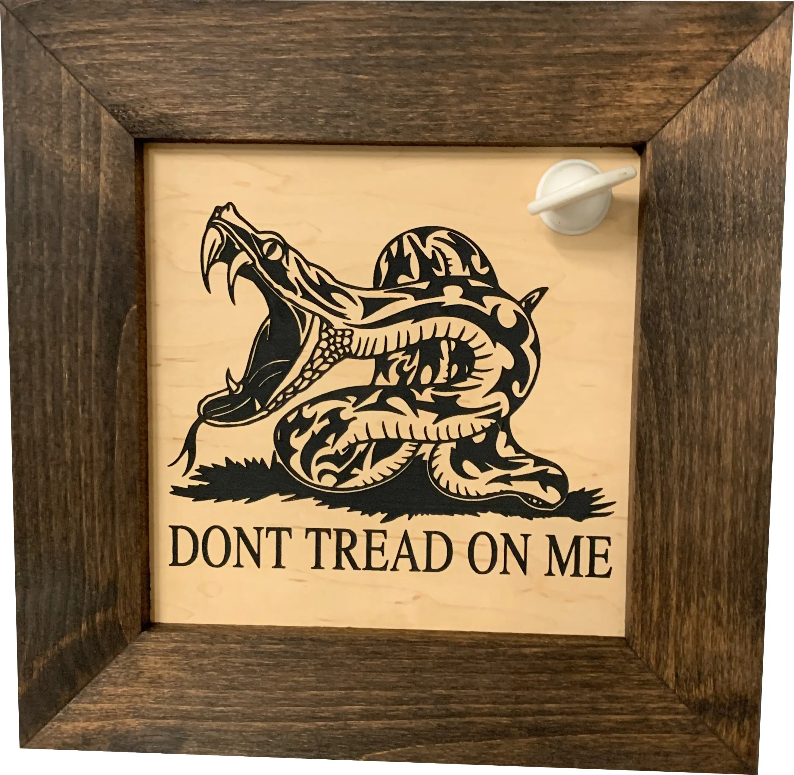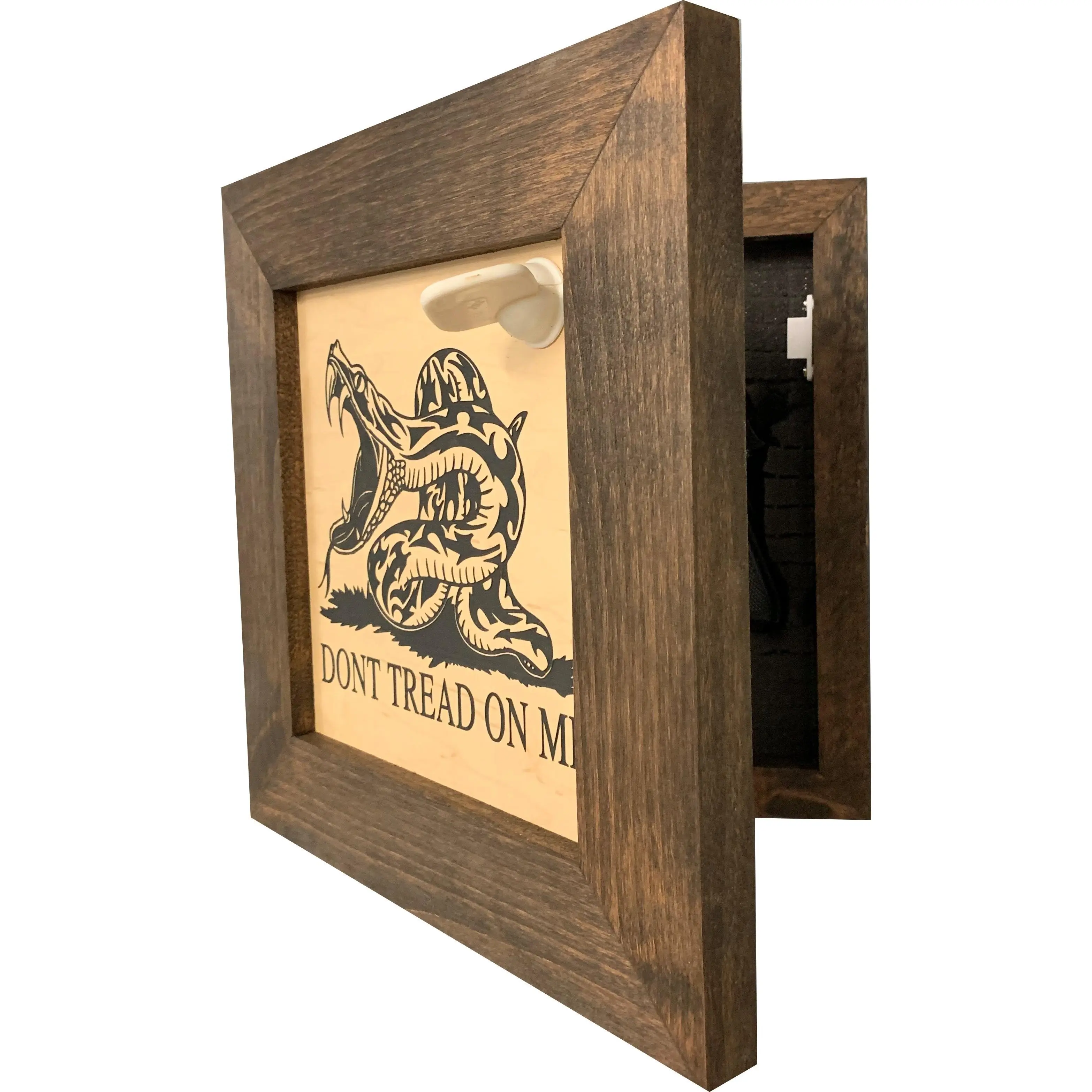 This 2nd Amendment hidden gun storage featuring a modern take on the Gadsden DONT TREAD ON ME design is stained dark walnut with a maple inset that is hand-painted. The cabinet includes a magnetic safety lock, customizable foam to secure your gun and all mounting hardware to hang on your wall. The cabinet has a very modern and hard-rock look.