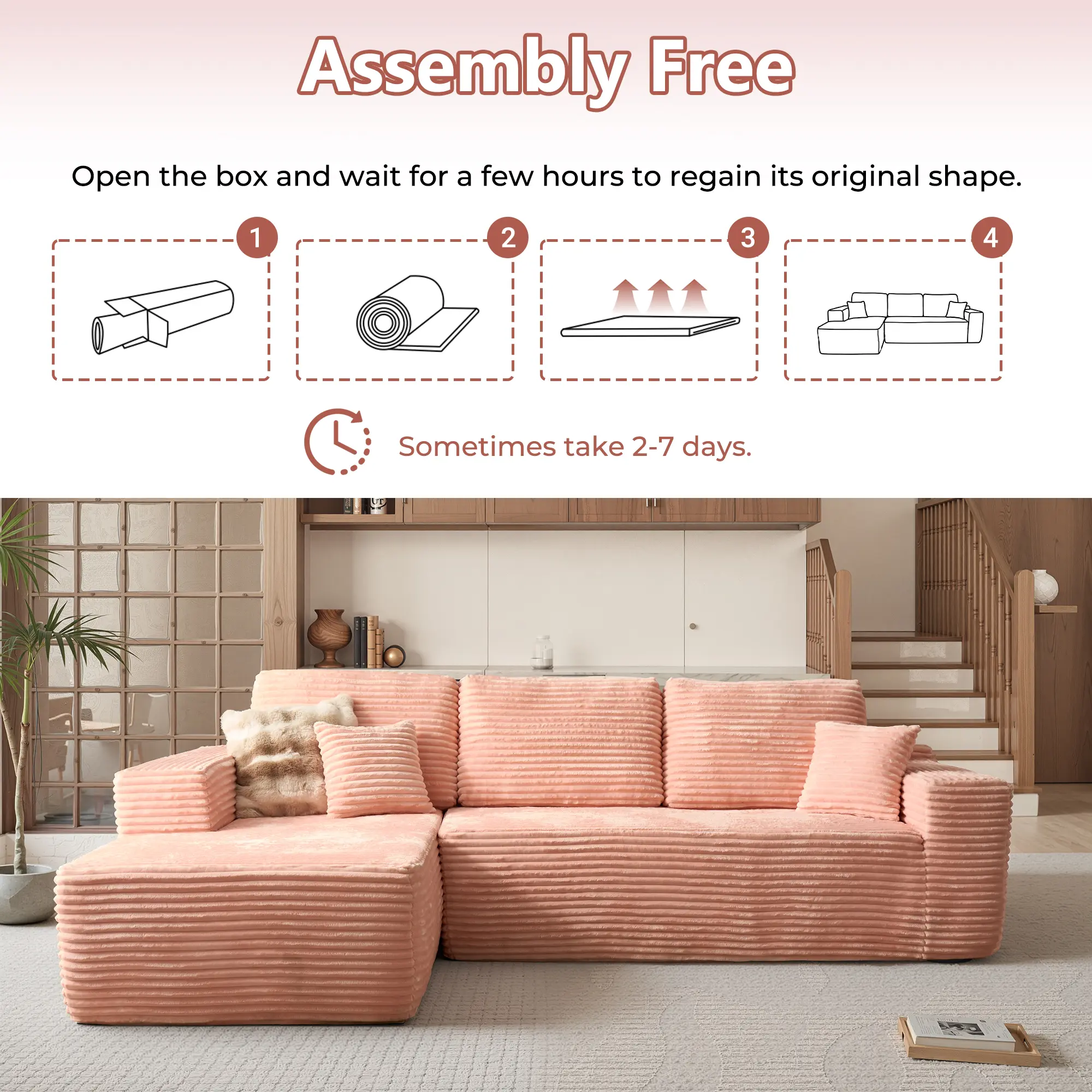 Enjoy the nirvana of no assembly required! Gently pat each section to enhance its elasticity after unpacking. Full recovery may take around 72 hours. Standard boxes fit elevators/apartments.