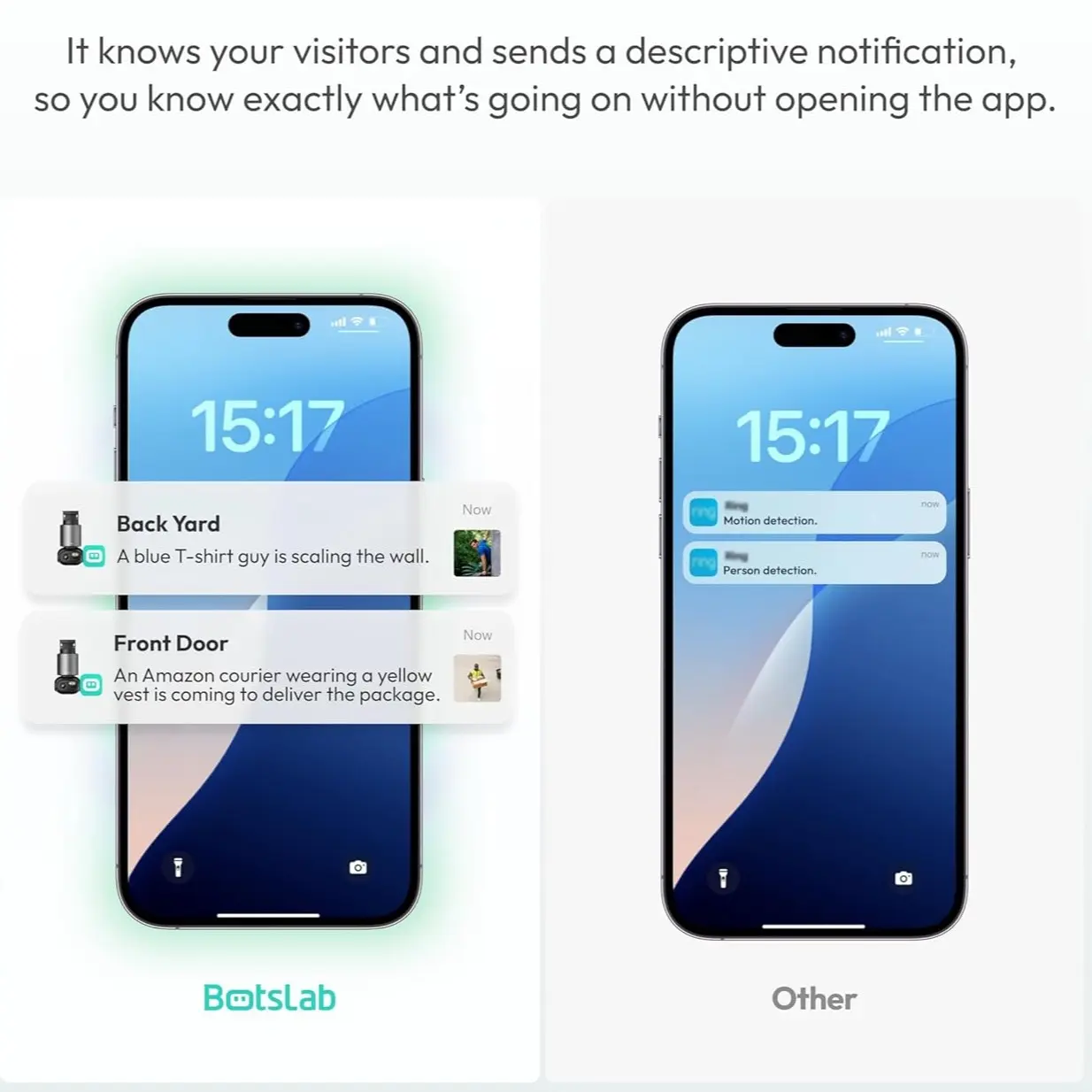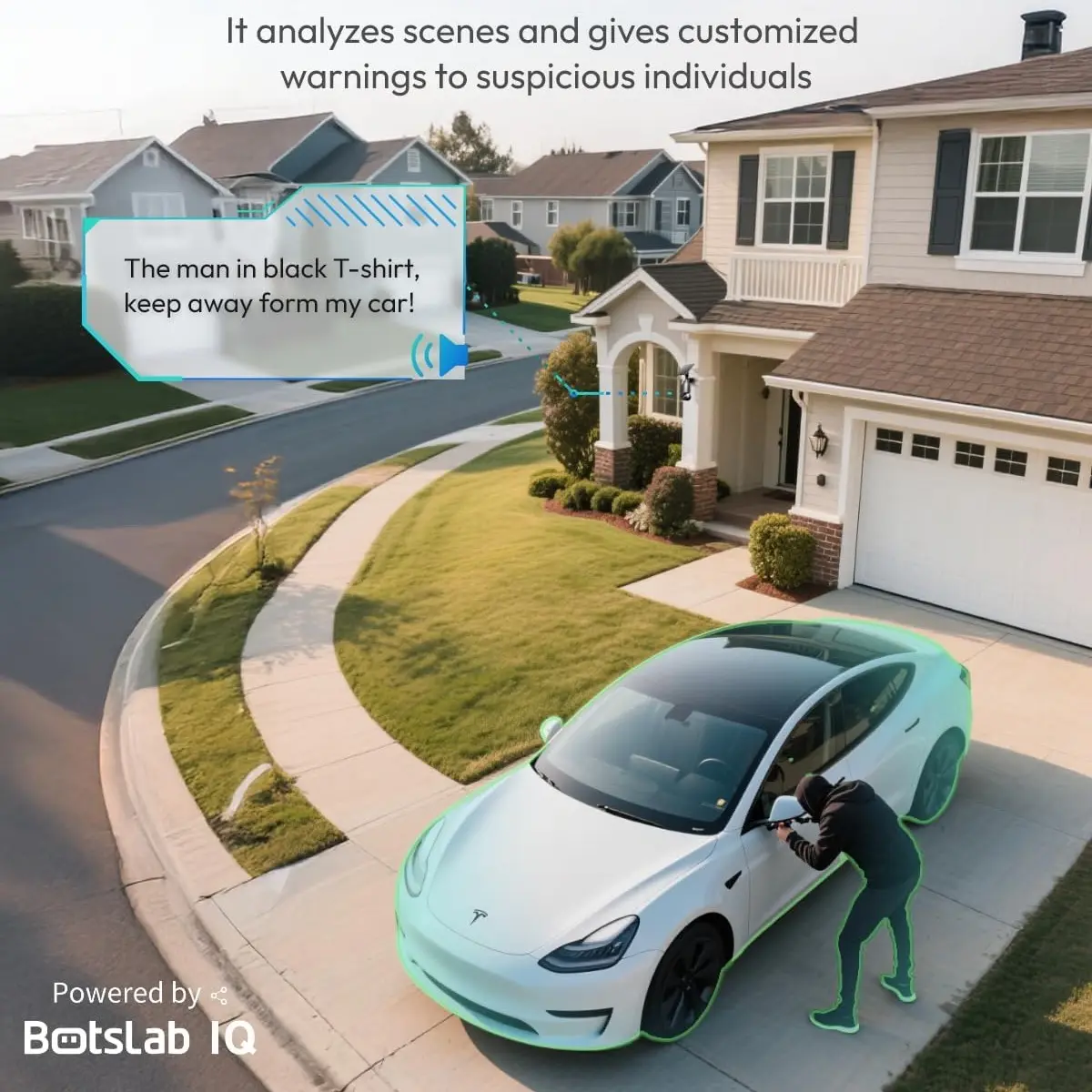 ·AI Recognition: Identifies visitors and sends notifications. Analyzes scenes, sending customized warnings based on severity.
