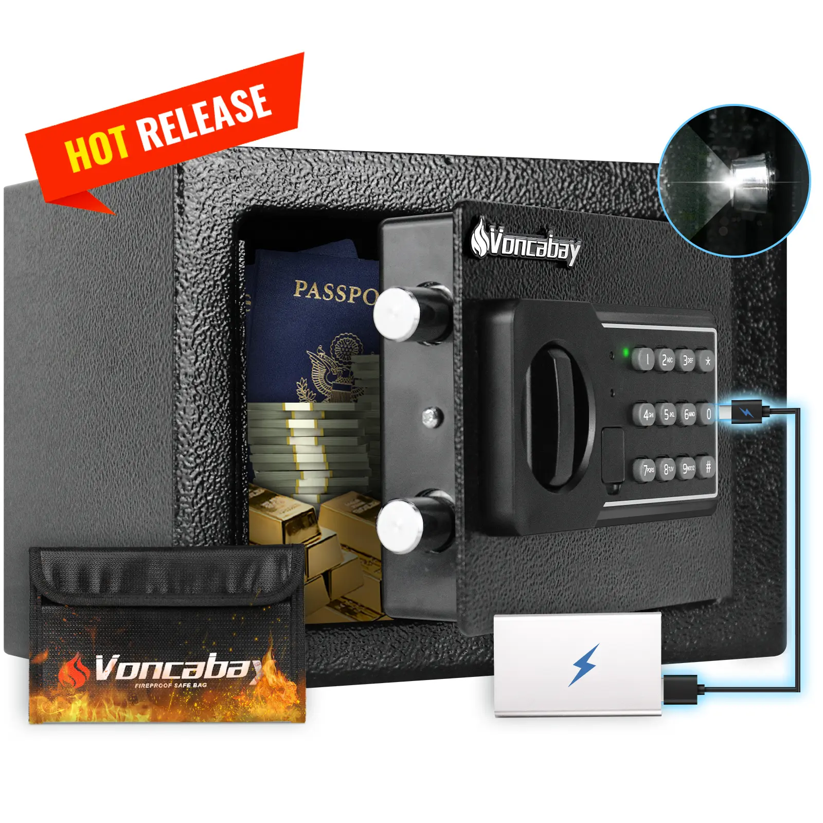 ·[Security Safe Box with Intelligent Sensor Light & Mute Function]: Voncabay Small Safe Box automatically turns on a soft light when opened with the keypad. The light turns off after 30 seconds. Additionally, the safe is also equipped with a silent function. To avoid disturbing others, press and hold the 1 button for 3 seconds to activate silent mode. Press and hold the 1 button for 3 seconds again; a long beep will indicate the sound is back on.