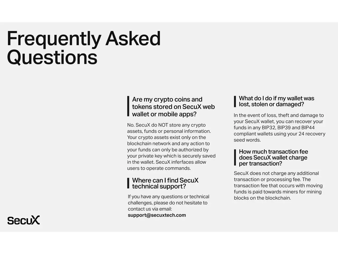 - All cryptocurrency management and transactions must be carried out through the SecuXess web app trading platform on the SecuX official website, or the iOS/Android app