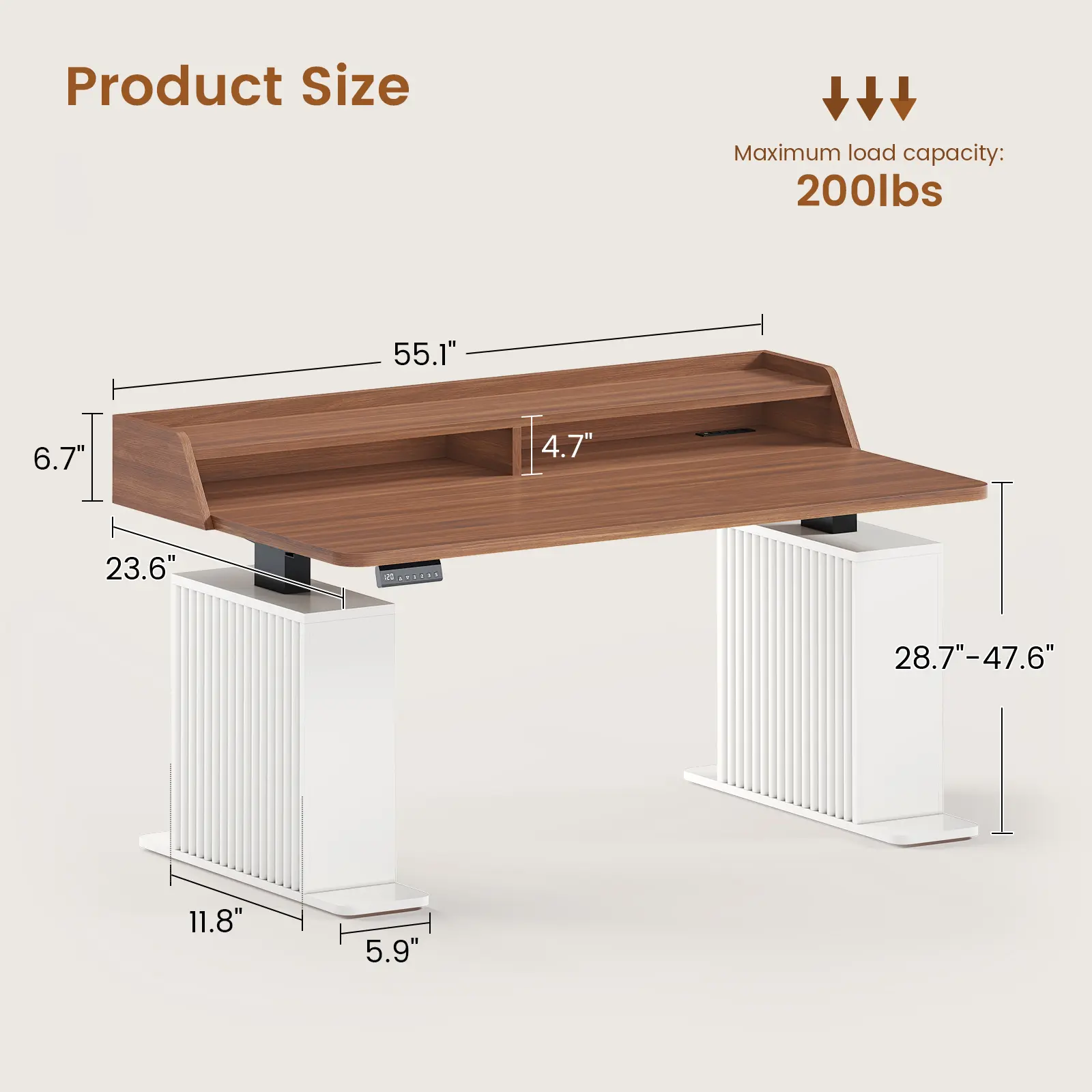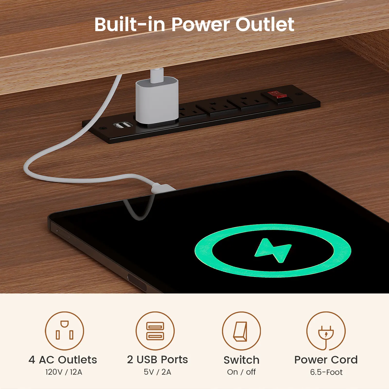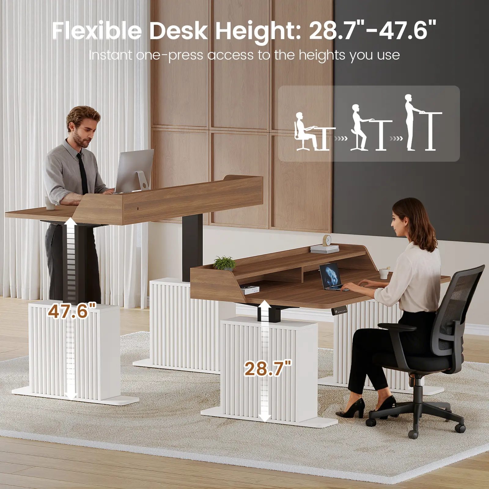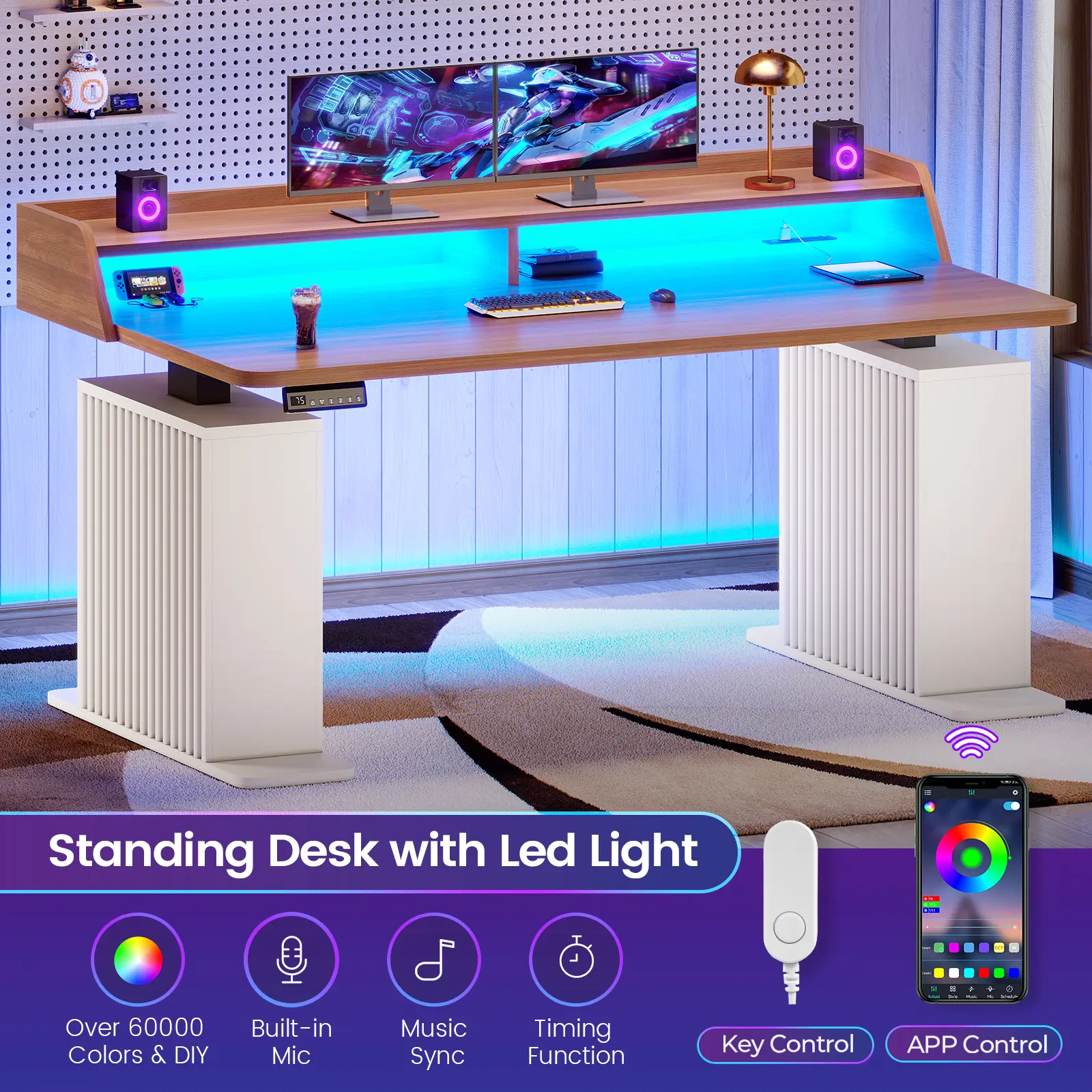 • Adjustable Height: 28.7"–47.6" range with 3 preset buttons for effortless sit-stand transitions. • Ergonomic Stand: Full-size monitor stand enhances posture and provides extra workspace storage. • Modern Style: Fluted panel design adds sophistication to any office or gaming setup. • Smart Features: 4 outlets, 2 USB ports, and RGB LED lights with 60,000+ colors and 29 modes. • High Performance: Smooth, quiet lift (≤30dB), 25mm/s speed, 220 lbs capacity, FSC-certified wood.
