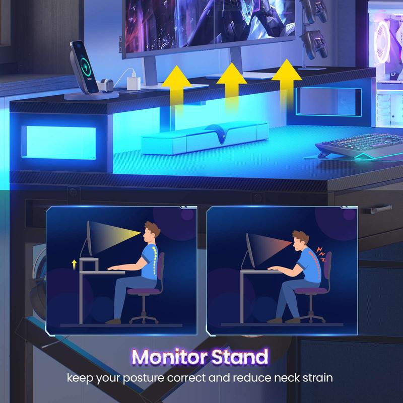 SEDETA 55 Inch Reversible Gaming Desk with 6 Drawers PC Desk with LED Lights Power Outlet Corner Computer Desk with Monitor Stand