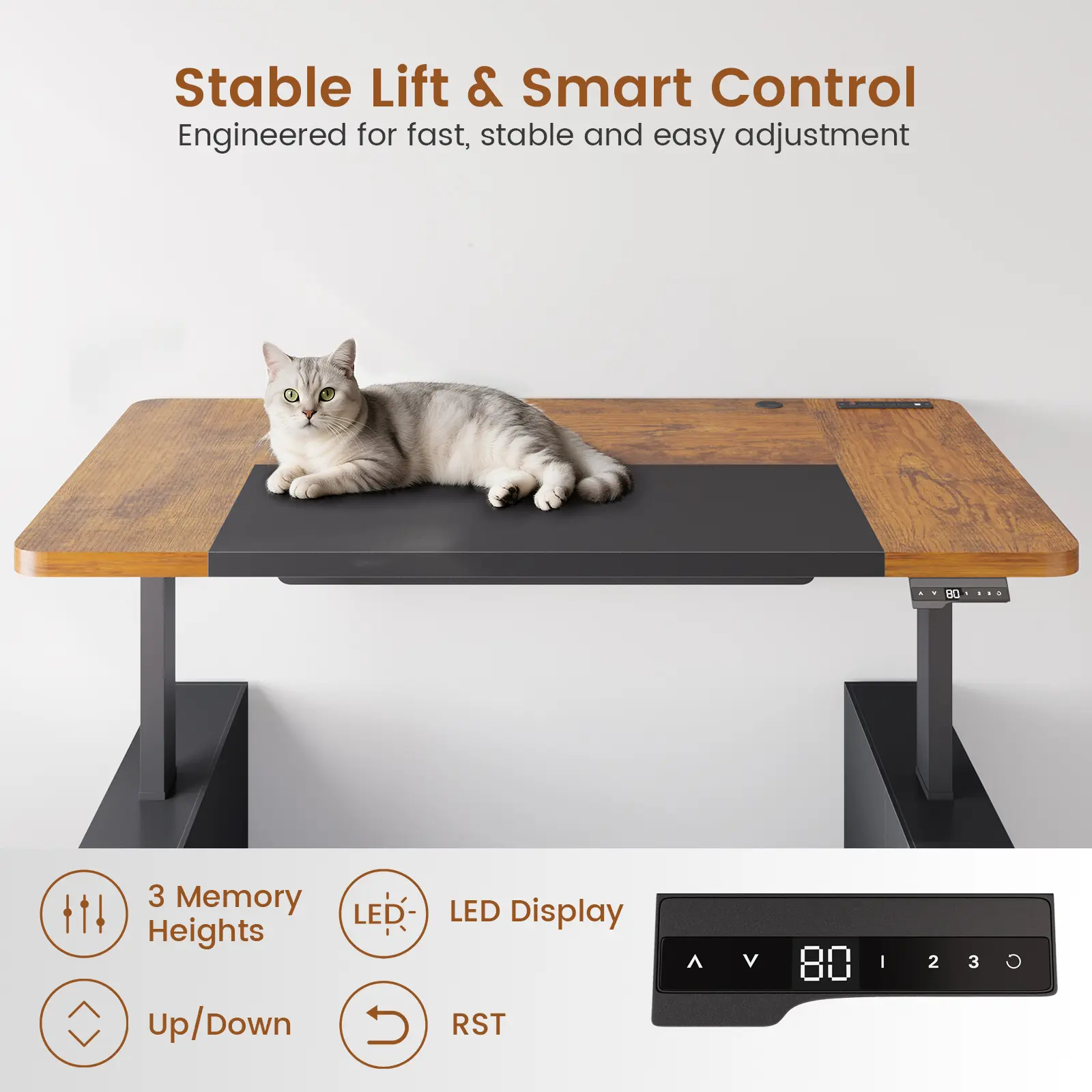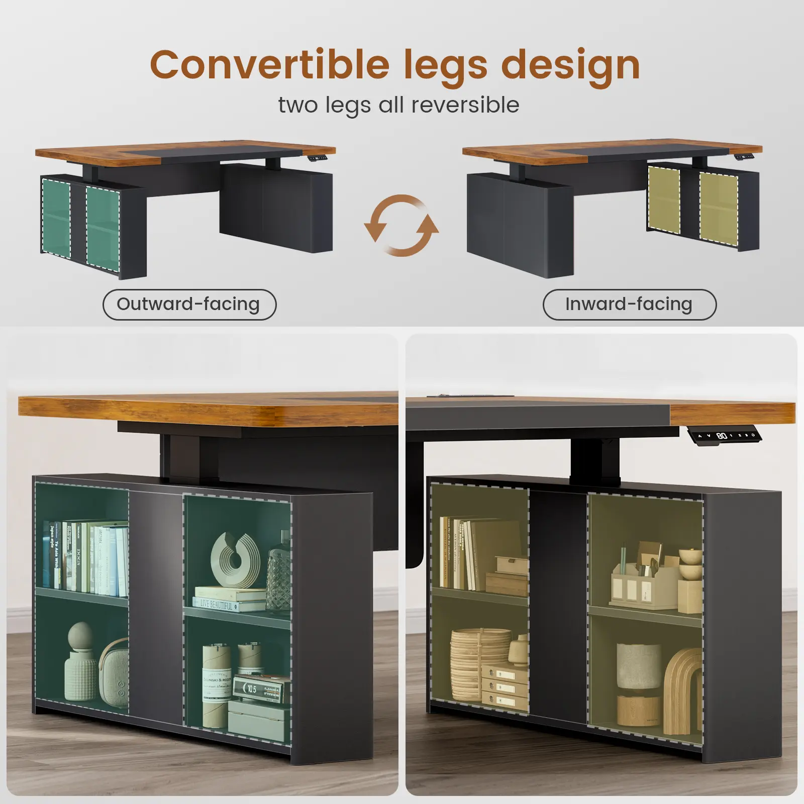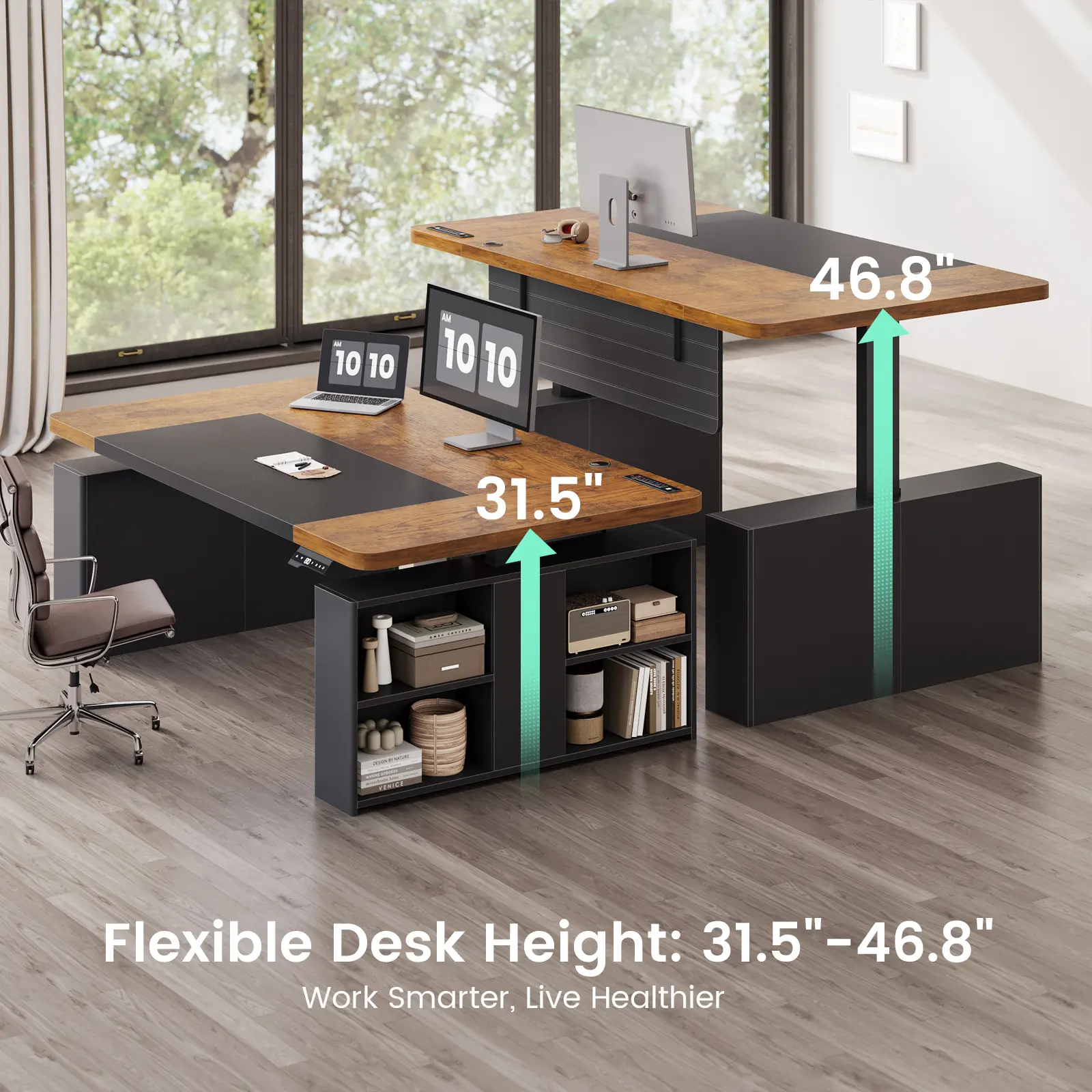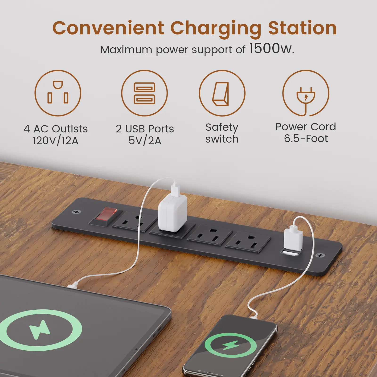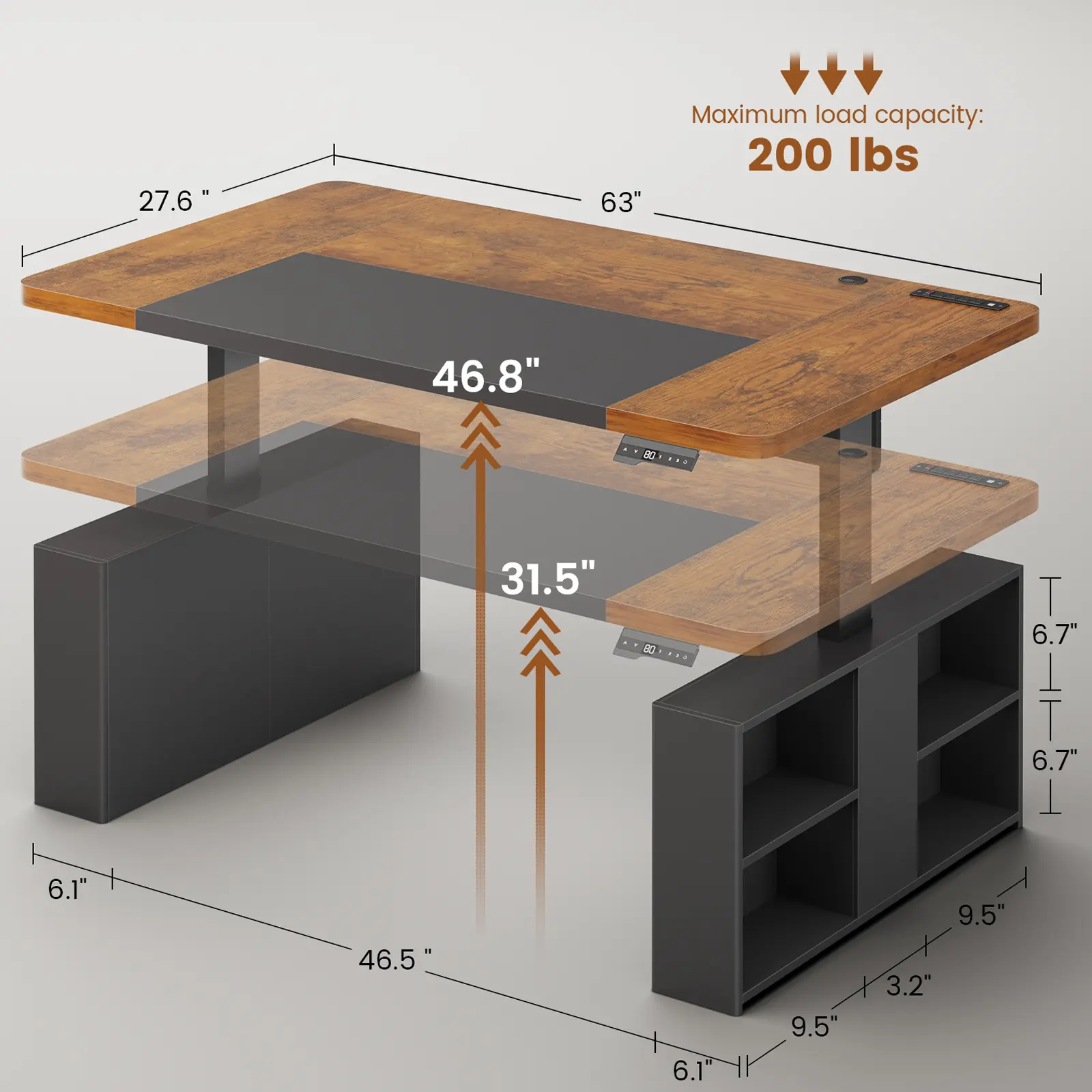 • Adjustable Height (31.5"–46.8"): 3 presets promote ergonomic posture, reduce sedentary habits. • Reversible Storage Legs: 8 open shelves for flexible, organized storage. • Spacious Desktop (63" x 27.6"): Whole-piece surface plus privacy panel for comfort, focus, and efficient multitasking. • Built-in Charging Ports: 4 outlets + 2 USB ports with safety switch for powering devices conveniently. • Durable & Stable Build: P2 particle board + steel, 200 lbs capacity, tested 60,000 lift cycles for lasting reliability.
