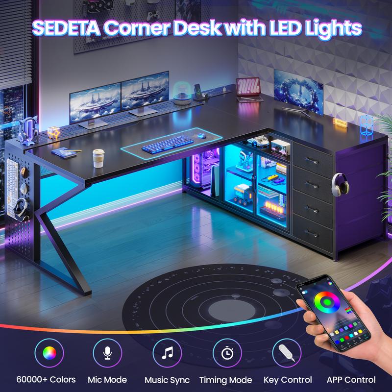 ·【Display Cabinet & Led Light】This gaming desk features a large display cabinet with LED lighting, offering ample space to showcase your decorations, photo albums, collectibles, and more. The cabinet doors protect items from dust while allowing you to clearly admire your displays. The SEDETA home office desk comes with RGB LED light strip, remote control via APP, Over 60000 colors and 29 flashing modes for your to choose.