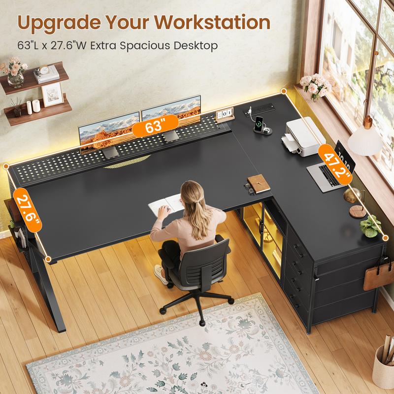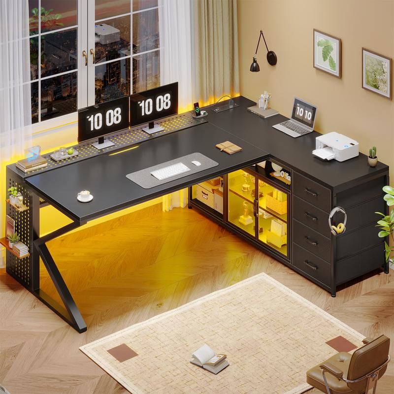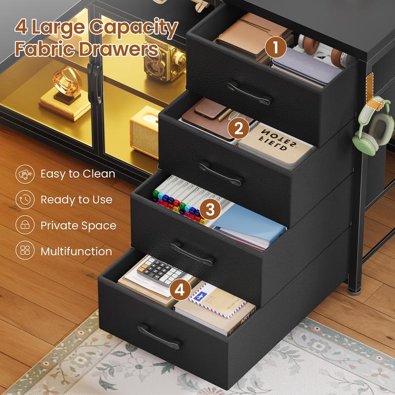 ·【Large Storage Space】L shaped desk with 4 storage drawers, adjustable display cabinet, cable management tray, 2 tiers open shelves, which offer enough space to store your daily items, books, files, printer stand or game figure, collect trophies, and souvenirs. The computer desk provides 4 easy to assemble fabric drawers. Drawers are made of breathable high-quality fabric, lightweight and easy to install while providing sufficient storage space.