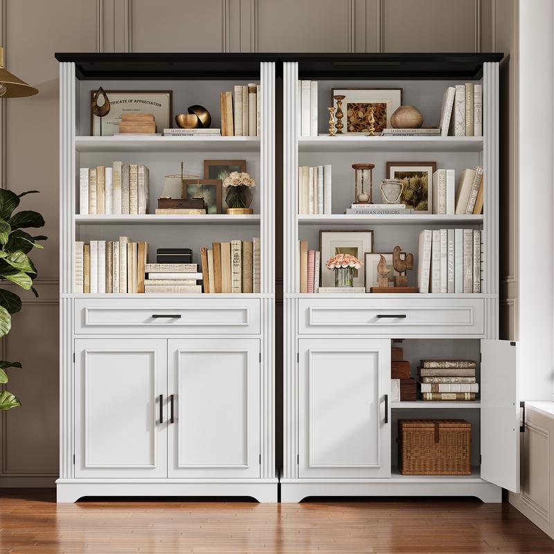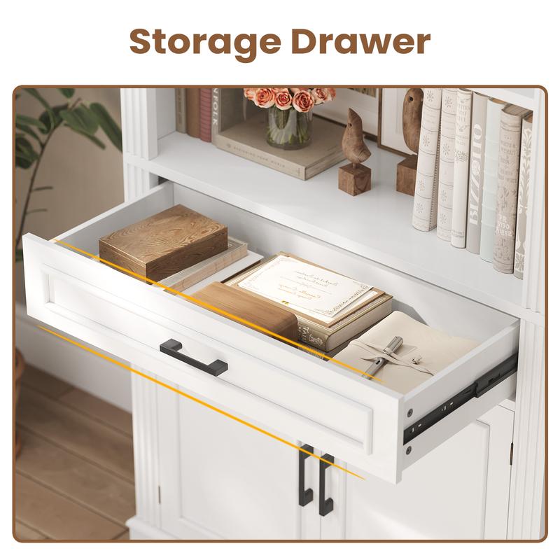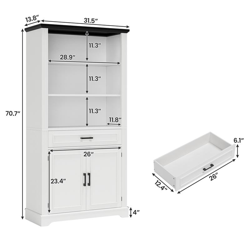 • Spacious Storage: 13.8"D x 31.5"W x 70.7"H offers ample vertical space for books and decor. • Hidden Storage: Features adjustable cabinet shelves and a drawer for concealed organization. • Strong & Durable: Made from P2 grade MDF; supports up to 300 lbs . • Farmhouse Charm: Handcrafted grooves create an elegant, rustic look. • Protected Delivery & Support: Shipped with foam and wood protection; professional after-sales team.