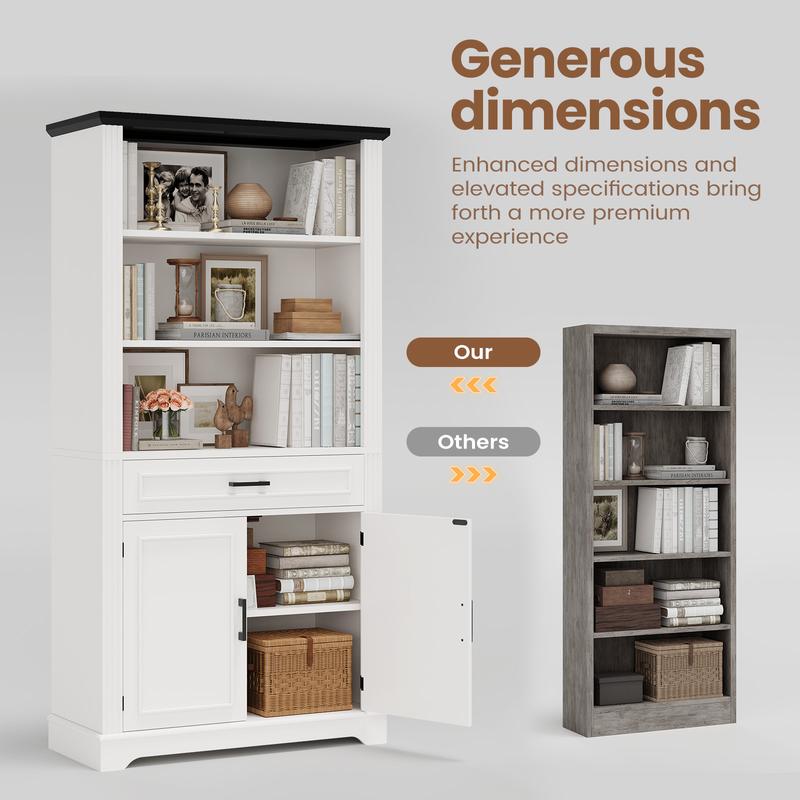 SEDETA Farmhouse Bookshelves and Bookcases with Doors and Drawer, Bookshelf with Storage, Floor Standing 6 Shelf Display Storage Shelves 70 in Tall Bookshelf for Home Office, Living Room