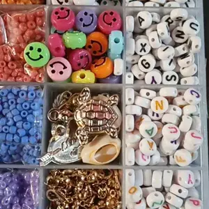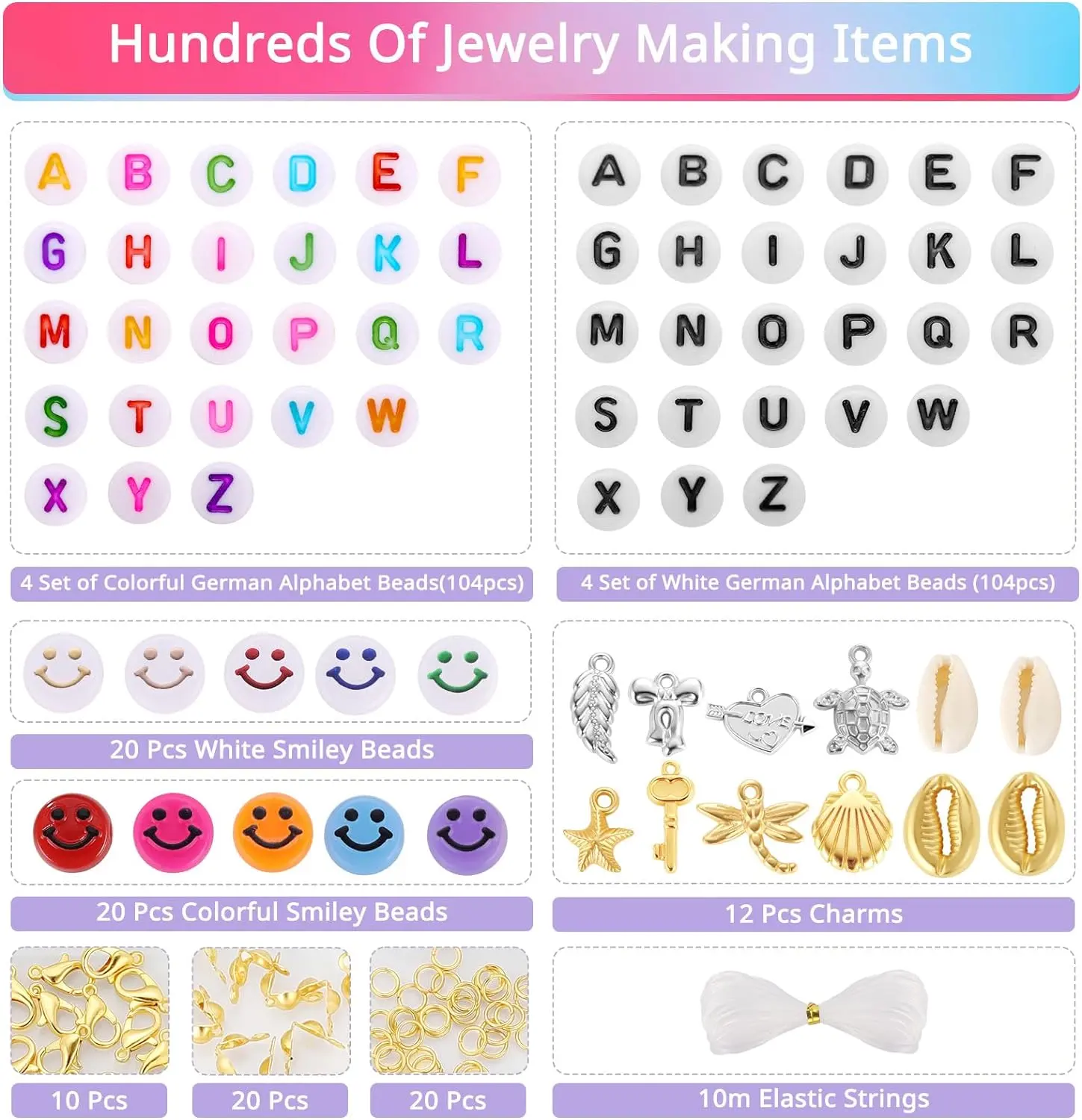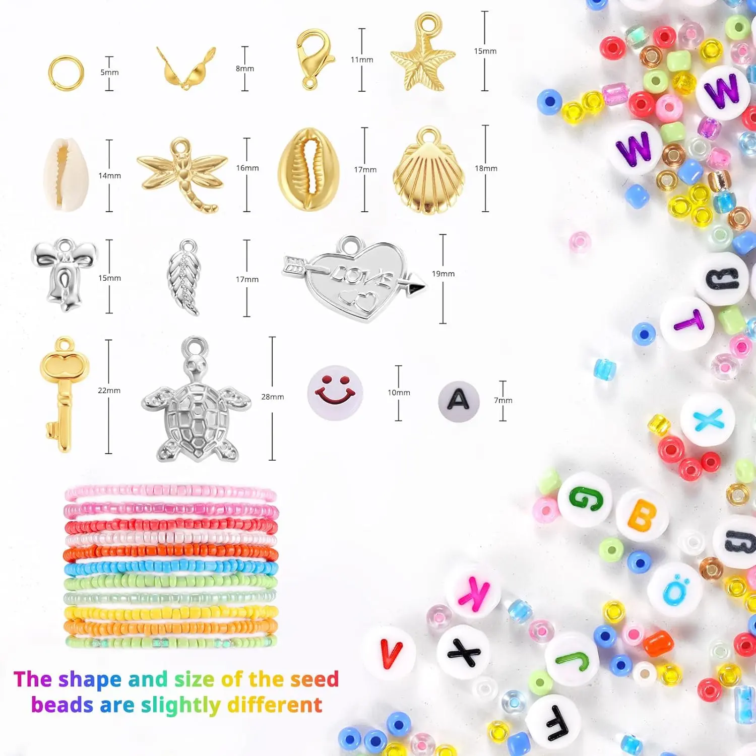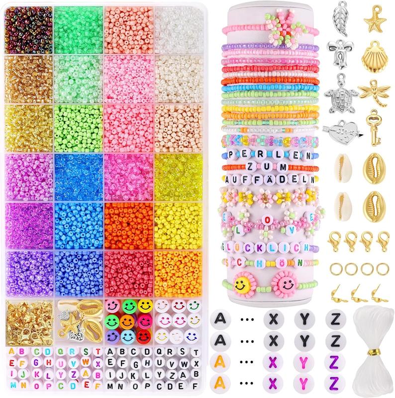 ·【Great Value Package】: This bracelet making kit includes 3600Counts 24 colors 3mm glass seed beads, 208 letter beads, 40Counts smiley face beads, 12Counts different charms, 20Counts open jump rings, 20Counts clamshell beads, 10Counts lobster clasp and 1 rolls 10m length elastic strings.